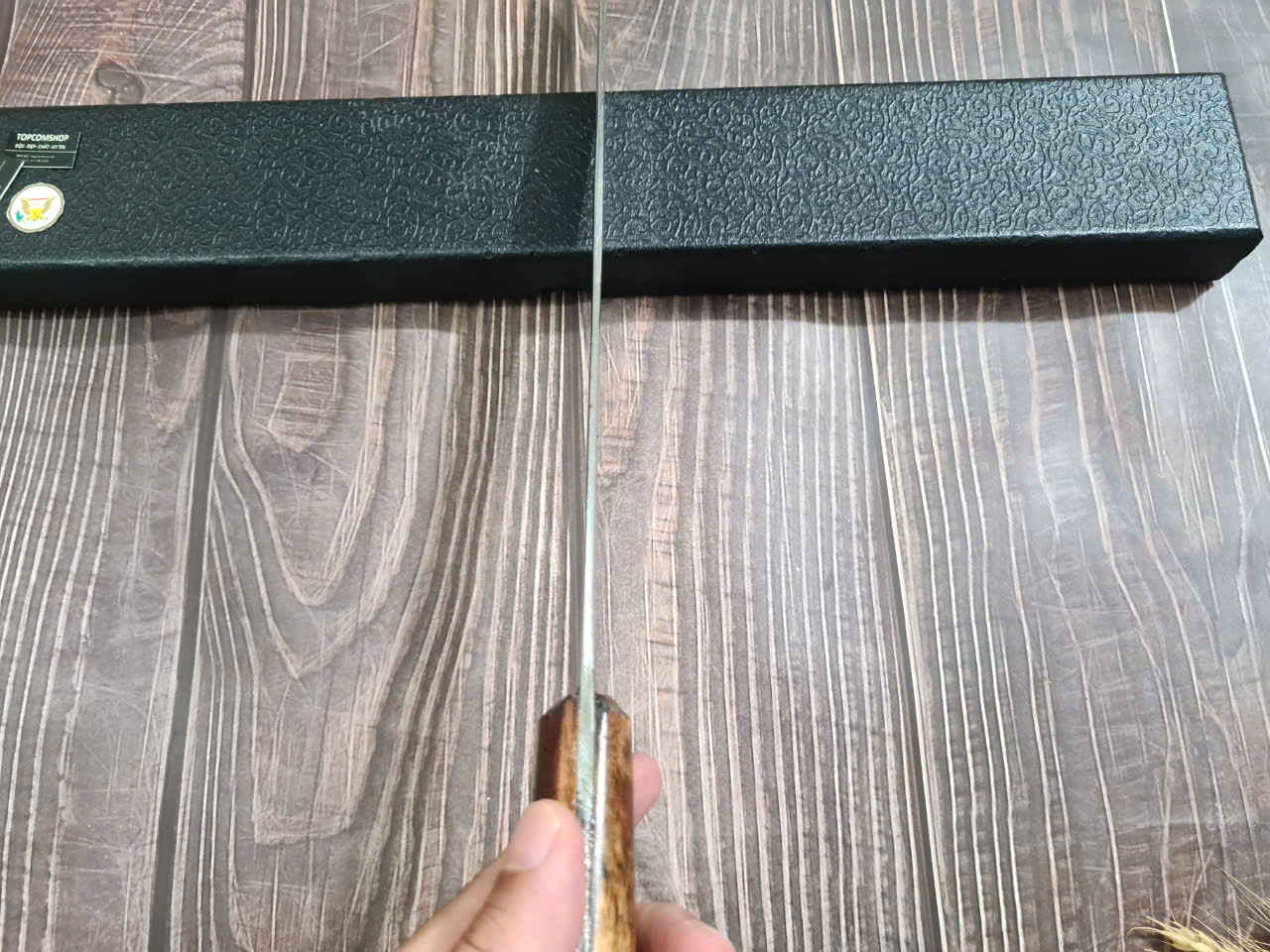 DAO BẾP SASHIMI MẶT HOA VĂN MÃ N4 THÔNG TIN SẢN PHẨM TỔNG DÀI : 45cm, LƯỠI: 30cm,RỘNG : 4cm, dày: 2.5mm, CHẤT liệu lưỡi: thép IFA cao cấp Chất liệu CÁN: gỗ Cẩm chỉ,
