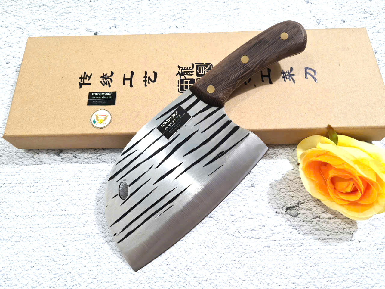 - Chức năng: Chặt xương ống, chân giò, trâu bò - Kích thước: Lưỡi: 22cm, cán: 10cm, rộng: 10cm, dầy: 5ly, trọng lượng: 800g - Cán : Gỗ mun, Khâu đồng đỏ , chốt đinh