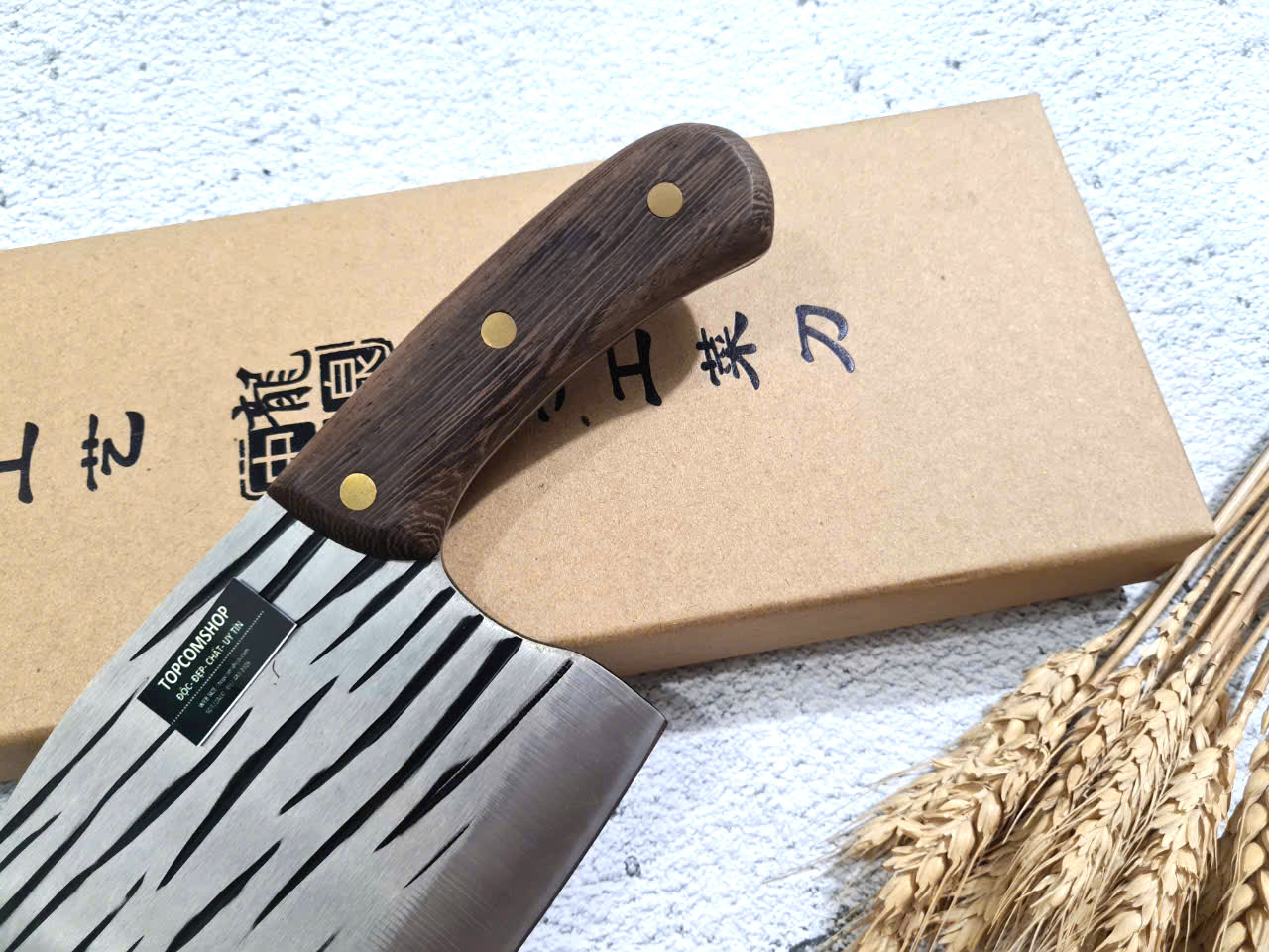 - Chức năng: Chặt xương ống, chân giò, trâu bò - Kích thước: Lưỡi: 22cm, cán: 10cm, rộng: 10cm, dầy: 5ly, trọng lượng: 800g - Cán : Gỗ mun, Khâu đồng đỏ , chốt đinh