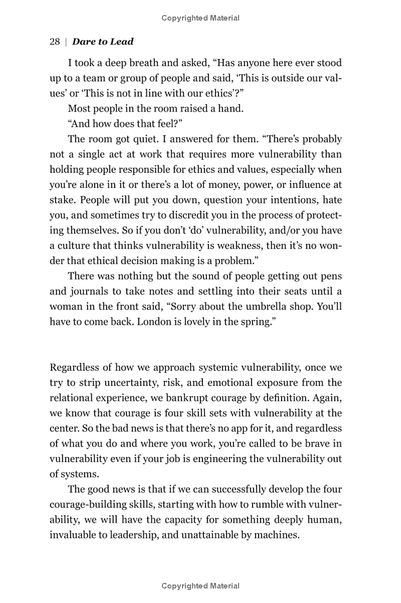 Brené writes, ‘One of the most important findings of my career is that courage can be taught, developed and measured. Courage is a collection of four skill sets supported by twenty-eight behaviours. All it requires is a commitment to doing bold work, having tough conversations and showing up with our whole hearts. Easy? No. Choosing courage over comfort is not easy. Worth it? Always. We want to be brave with our lives and work. It's why we're here.’