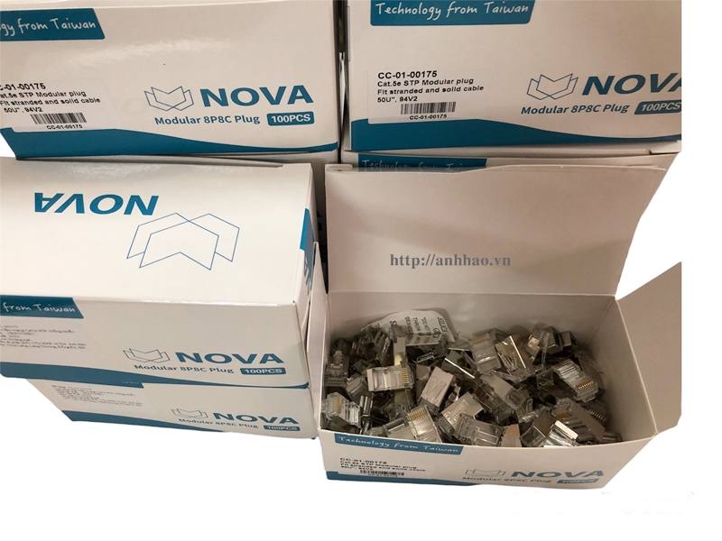 Đầu bấm mạng RJ45 Cat5 chống nhiễu Nova  chính hãng là dòng sản phẩm cao cấp do công ty Ánh Hào nhập khẩu và phân phối trực tiếp.Hạt mạng RJ45 Cat5e Nova chống nhiễu được sản xuất trên dây chuyền hiện đại của Đài Loan, chân tiếp xúc được làm từ 100% đồng mạ vàng 50U bằng máy X-ray đảm bảo độ chính xác tối đa nhất cho mỗi đầu bấm được xuất ra thị trường.