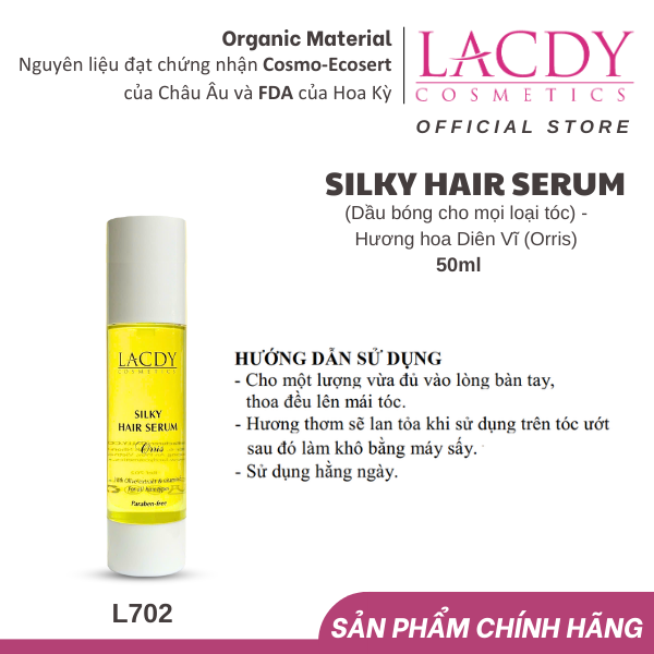 Mua tại TiktokSILKY HAIR SERUM (Dầu bóng cho mọi loại tóc) - Hương hoa Diên Vĩ (Orris) Dầu bóng dành cho mọi loại tóc, đặc biệt cho tóc khô, gãy, rụng, chẻ ngọn. Với dầu olive, chiết xuất từ lá Olive và vitamin E hấp thụ nhanh vào tóc giúp gỡ rối, làm mềm, bóng mượt, ngăn chặn quá trình lão hóa của tóc. Hương hoa Diên Vĩ nhẹ nhàng tinh tế. CÔNG DỤNG