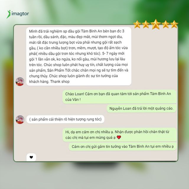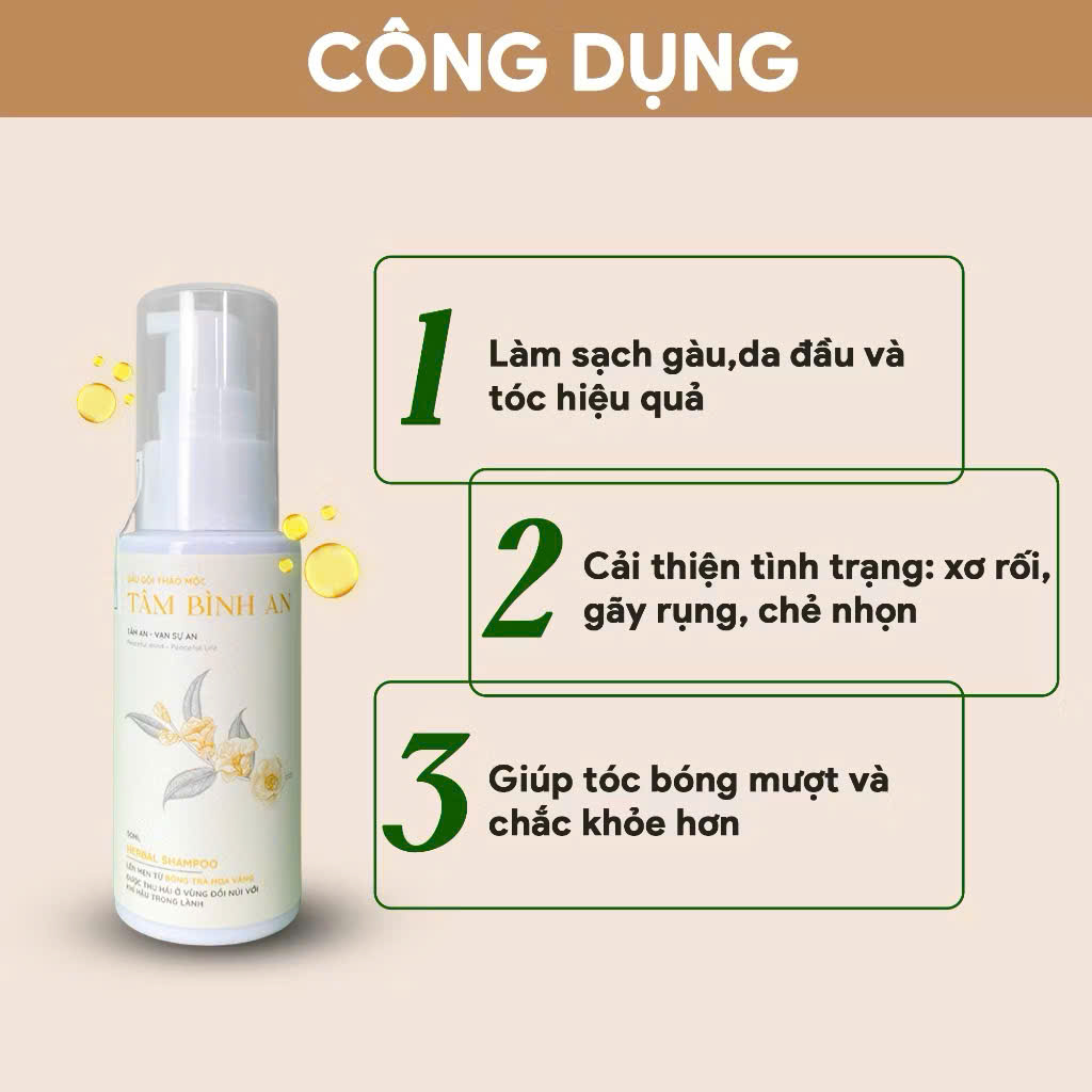 Mua tại TiktokMô tả: Dầu gội thảo mộc Tâm Bình An giữ tron tinh túy từ các nguyên liệu thiên, cung cấp dưỡng chất từ dược liệu quý Trà Hoa Vàng giàu chất EGCG chống oxy hóa, giảm viêm nhiễm, kích thích tuần hoàn máu, giảm ngứa, tóc mọc chắc khỏe, giảm gàu và mềm mượt. Giúp tóc và da đầu được bảo vệ bởi lớp màng ẩm và mang lại hương thơm thảo dược thiên nhiên. Ưu điểm: