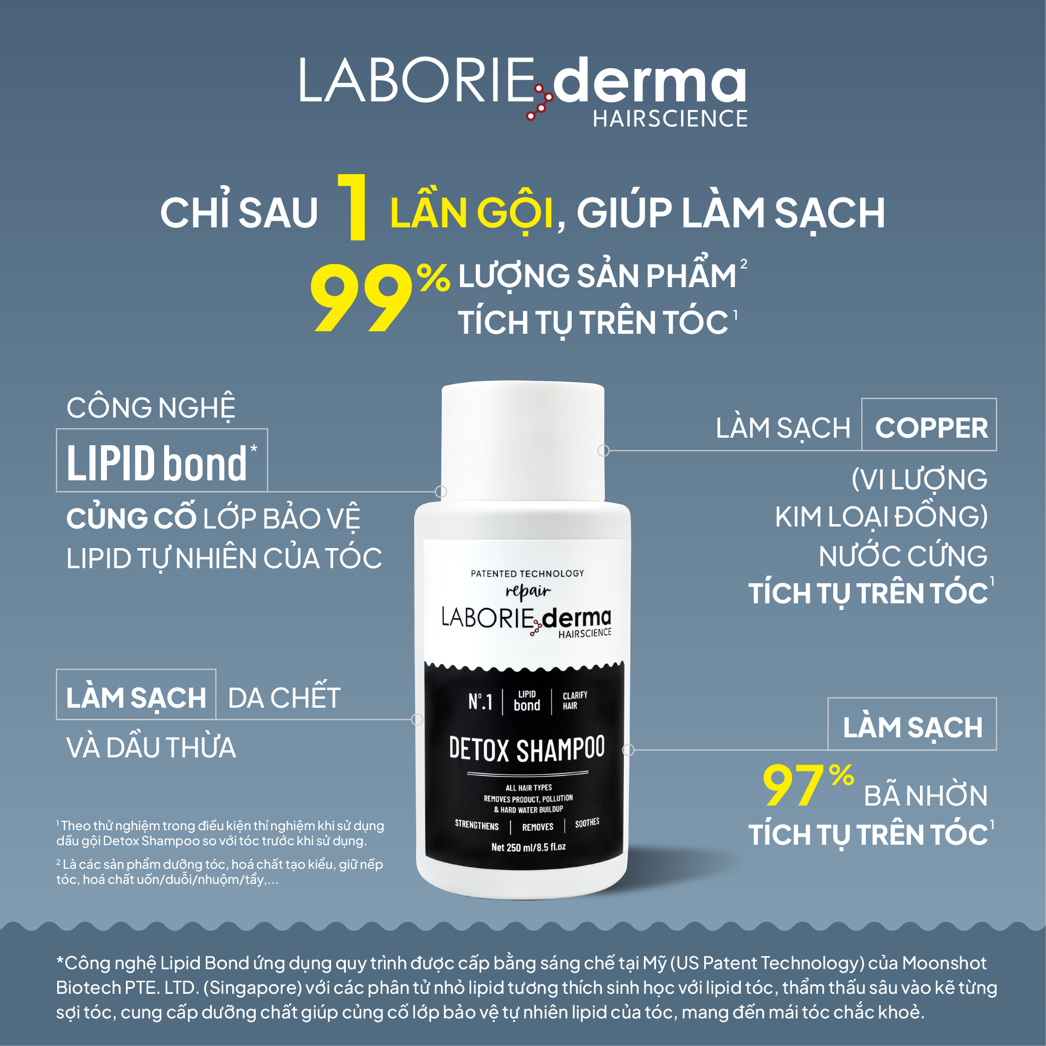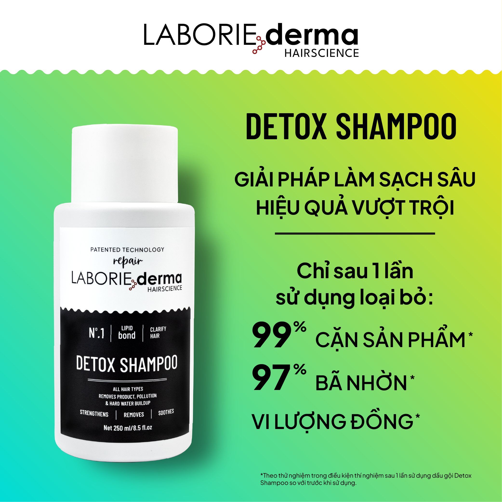 Detox Shampoo an toàn cho màu nhuộm, sạch s â u nhưng không làm b o n g t r ó c. Ứng dụng công nghệ LABORIE derma Lipid Bond đã được cấp bằng sáng