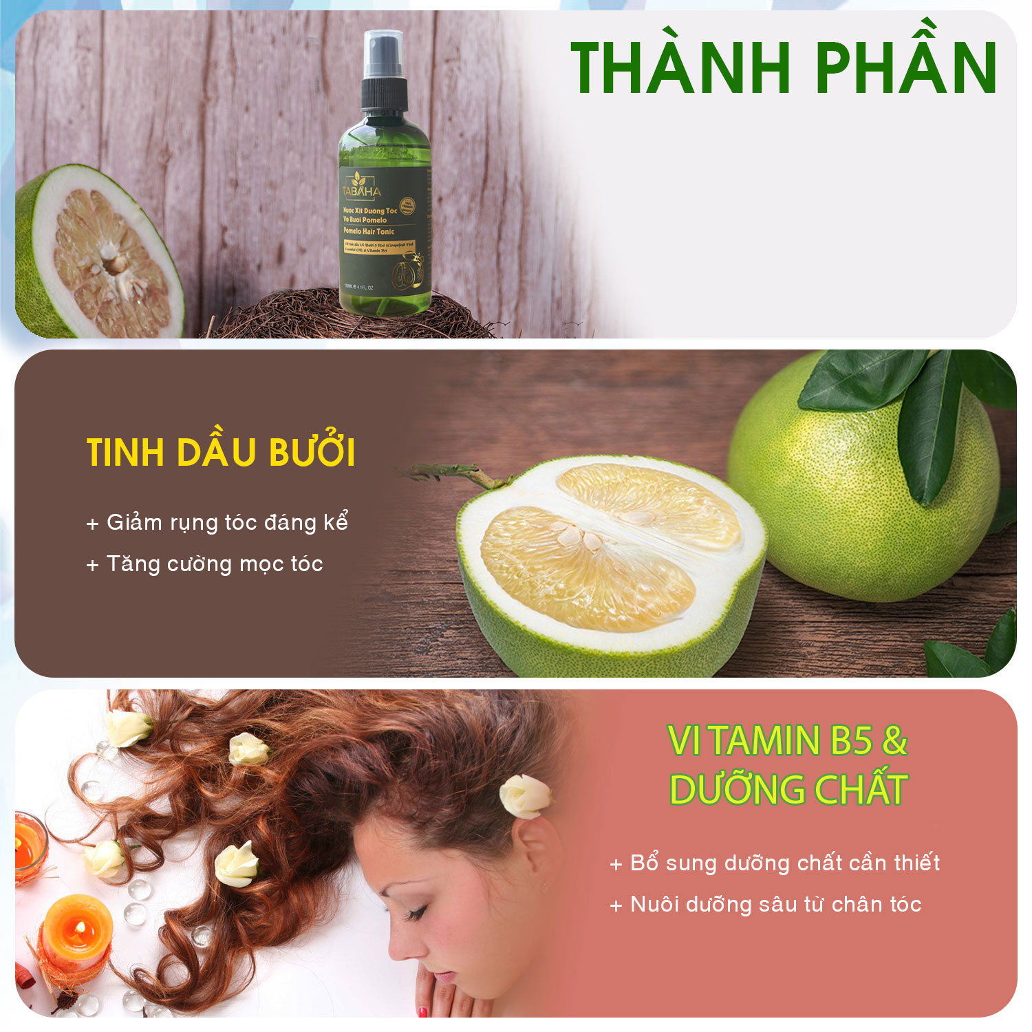 Tác dụng đáng nói nhất của Tinh Dầu Bưởi Pomelo Tabaha 120ml" chính là việc ngăn rụng róc và kích thích mọc nhanh chóng