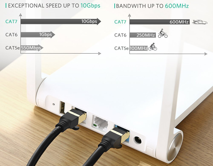 Cáp theo tiêu chuẩn 10GBBASE-T và với một tốc độ rực lên đến 600MHz, do đó bạn có thể kết nối với mạng LAN / WAN của bạn phân đoạn và kết nối mạng thiết bị ở tốc độ tối đa.