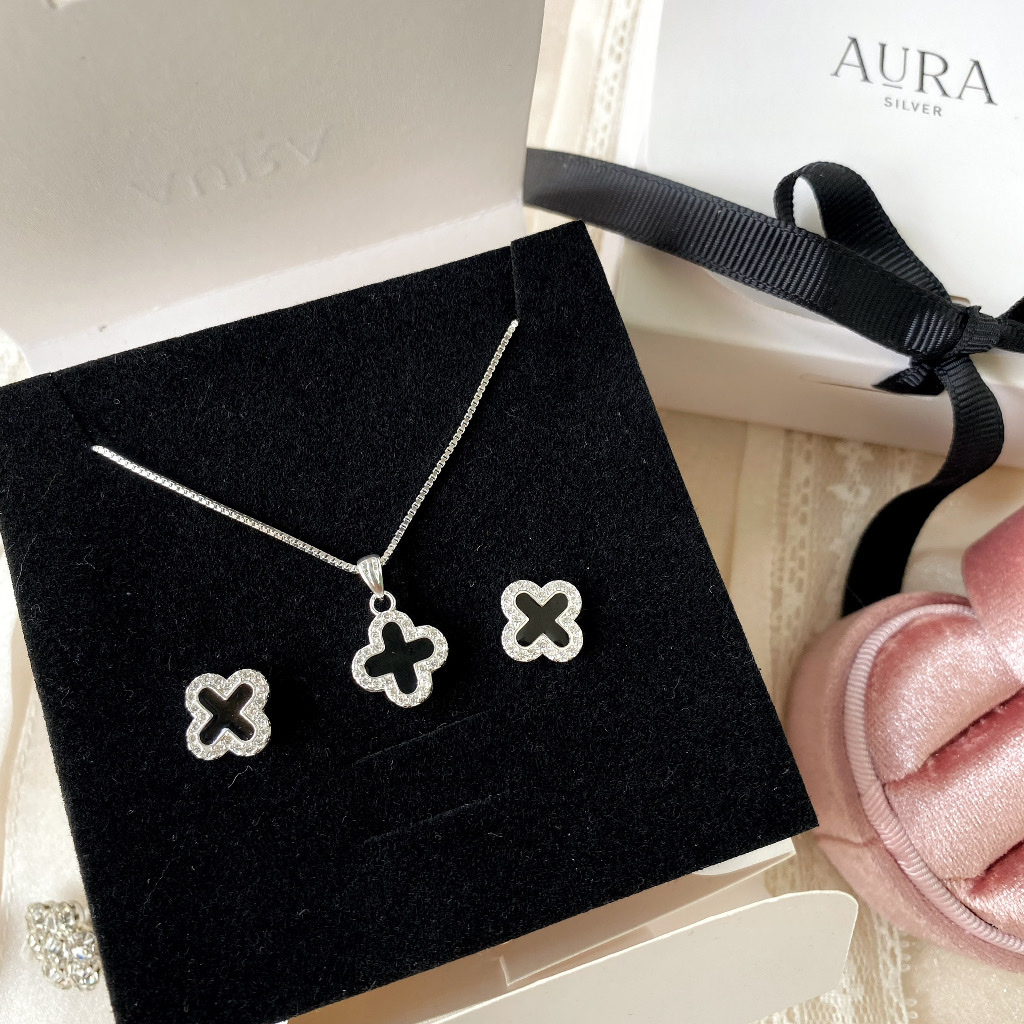 Dây Chuyền Bạc 925 Cỏ 4 Lá May Mắn Đeo 2 Mặt Đen Trắng Đính Đá CZ Cao Cấp Chính Hãng DMD522