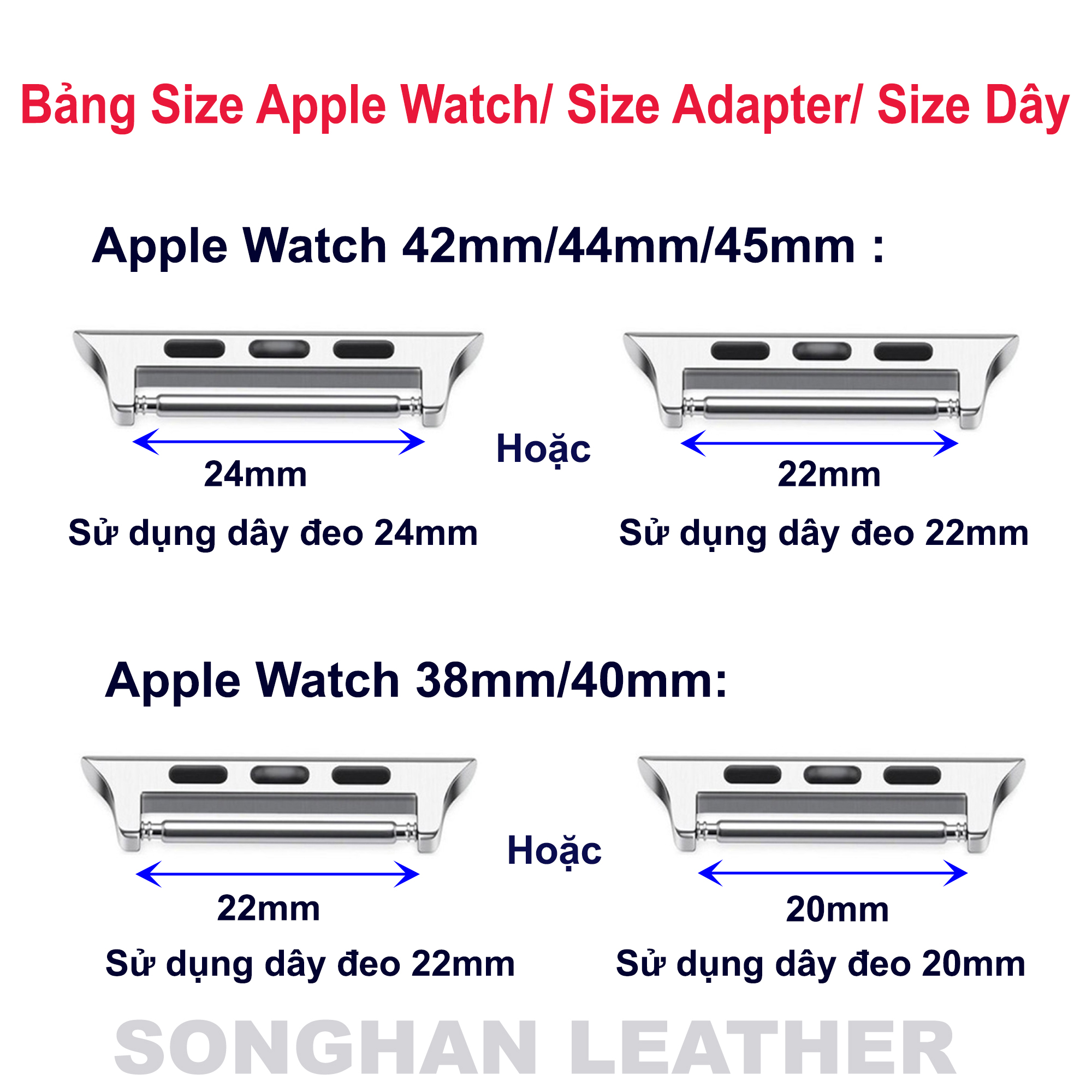 HƯỚNG DẪN CHỌN DÂY APPLE WATCH: Có 2 cỡ adapter: - iWatch 38mm, 40mm, 41mm dùng cùng 1 loại adapter; - iWatch 42mm 44mm, 45mm dùng cùng 1 loại adapter - Khách hàng xem cỡ được ghi ở mặt sau đồng hồ