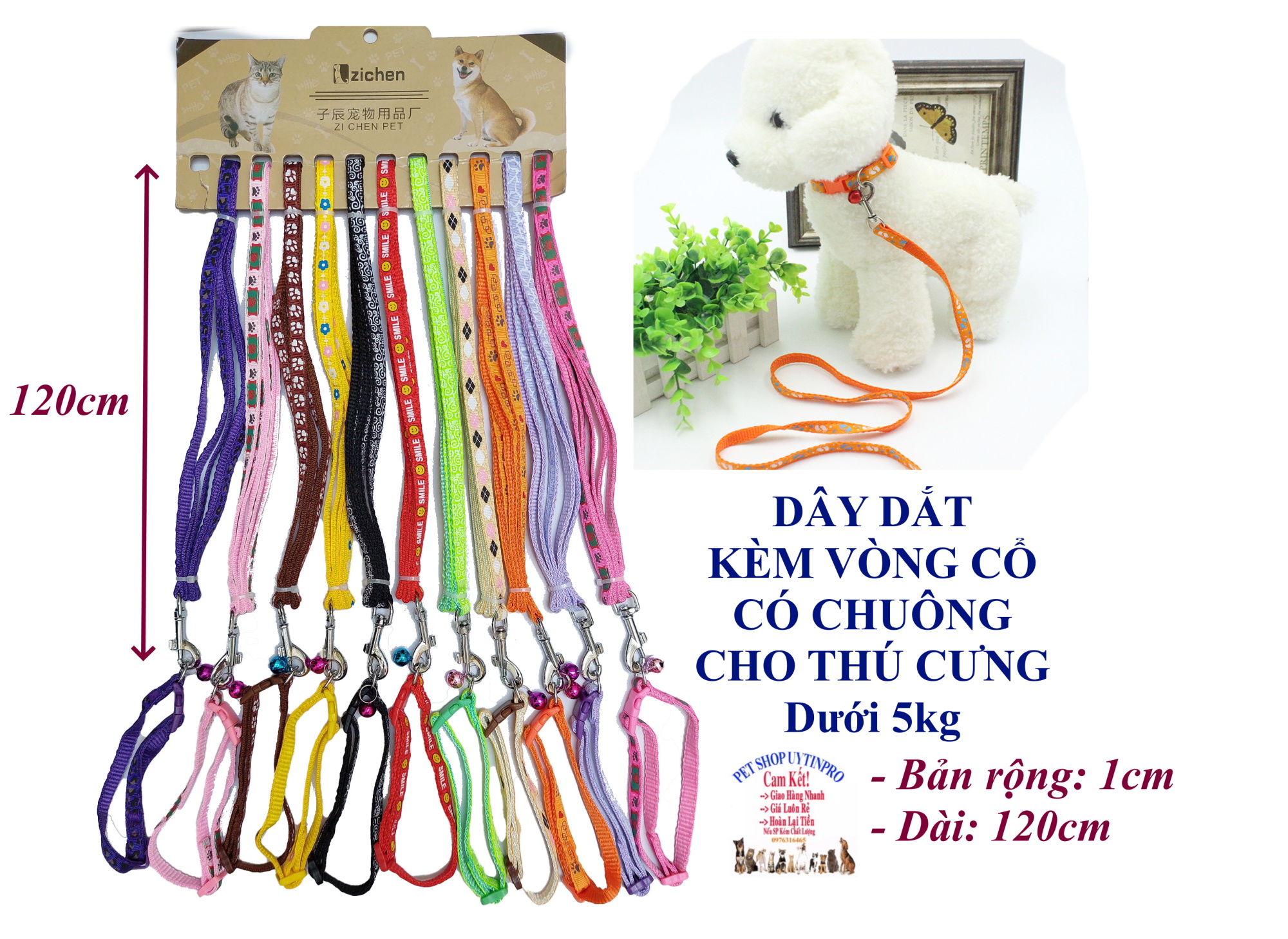 Dây dắt kèm vòng cổ có chuông cho Chó Mèo Dưới 5kg Bản rộng 1cm Dài 120cm Zichen In hình bất kỳ Chất liệu dù cao cấp * Kích Thước đóng gói gồm: - Dây