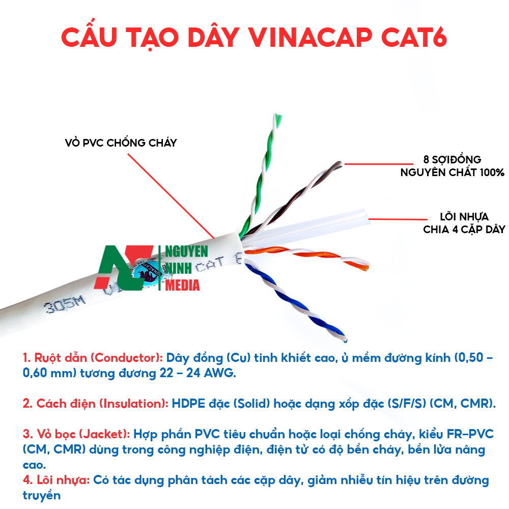 Cấu trúc cơ bản dây cáp mạng Vinacap Cat6 UTP