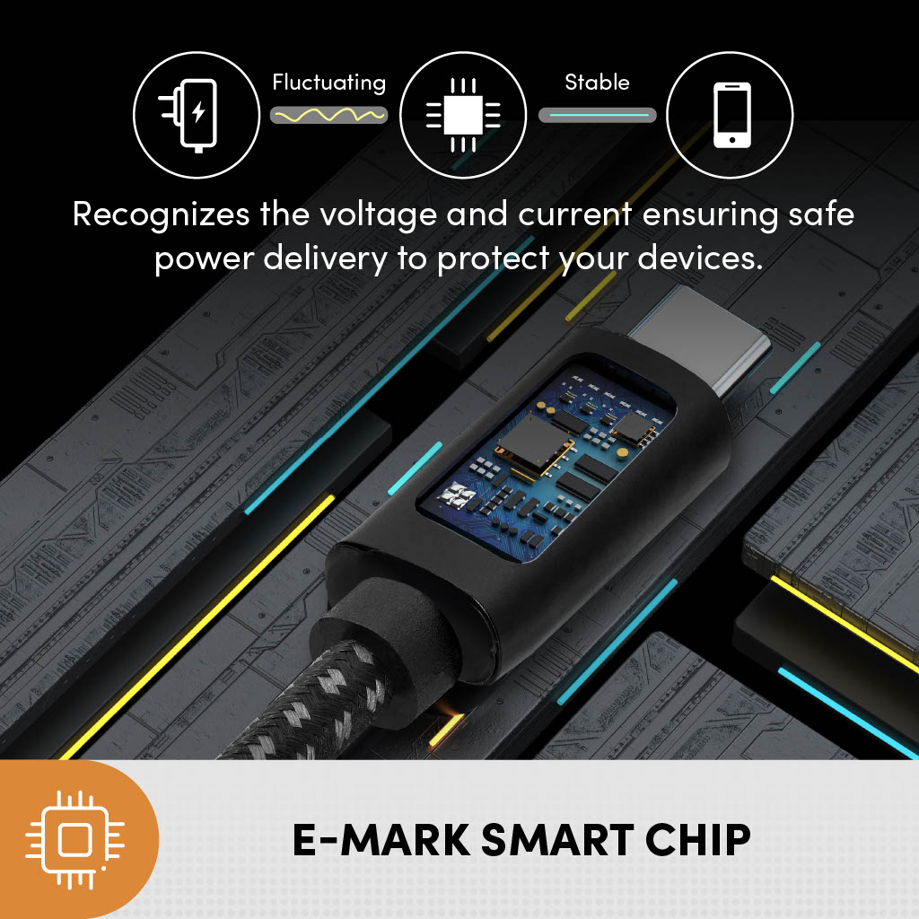 • Chip thông minh E-Mark: Đạt được tốc độ truyền dữ liệu nhanh hơn và truyền tải điện năng cao hơn đồng thời mà không ảnh hưởng đến sự an toàn.