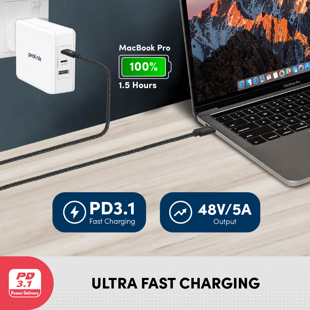 Dây sạc C to C PROLiNK GCC_240G3 dài 2m, sạc nhanh 240W chuẩn PD 3.1, truyền dữ liệu 40Gbps, xuất hình ảnh 8K Ultra HD