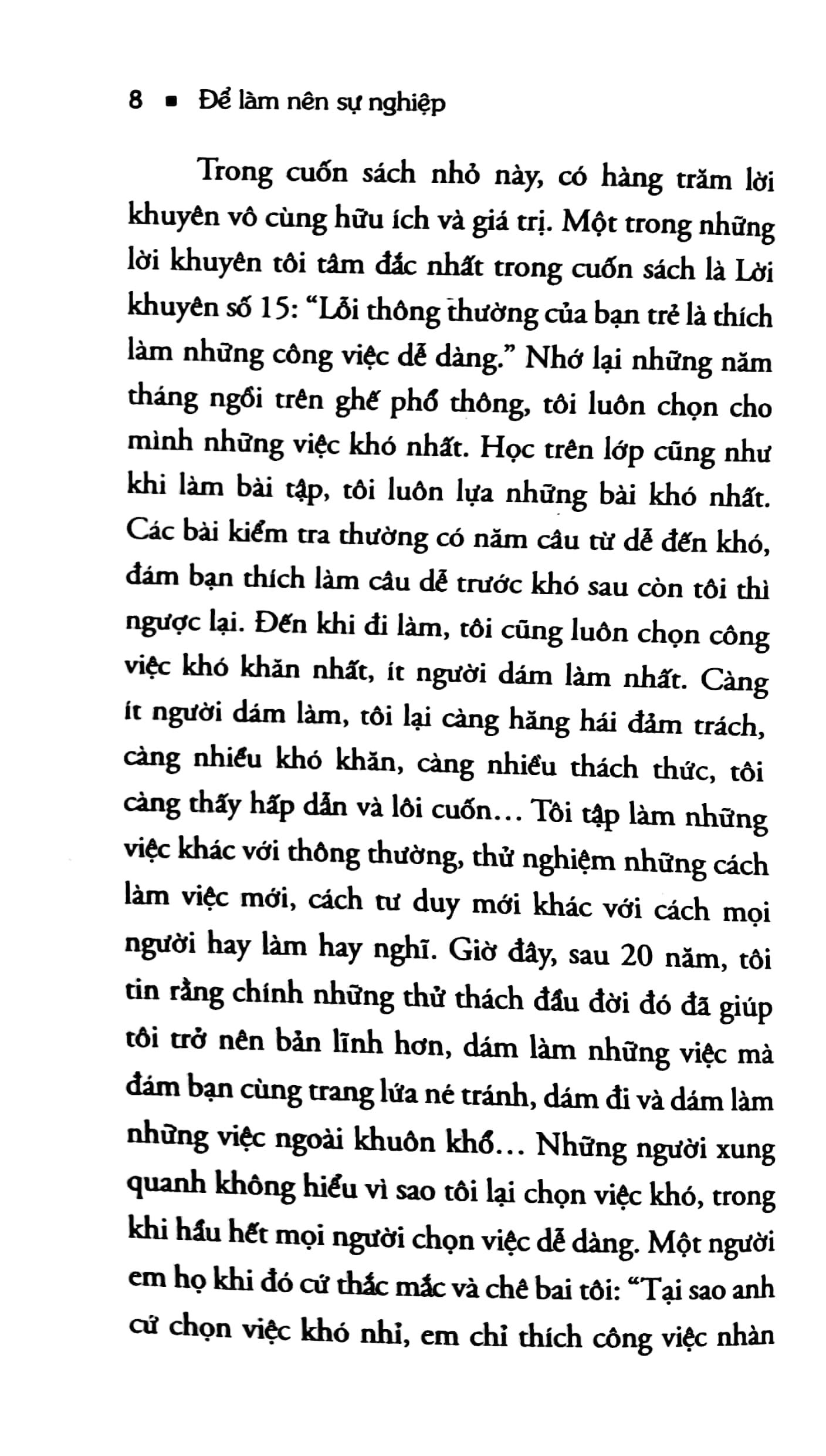 “Năm 1989, tôi bước chân vào giảng đường đại học. Cả một bầu trời tri thức, cả một thế giới với những điều mới lạ, cũng như đầy khó khăn mở ra trước mắt tôi. Tôi không còn là cậu học sinh phổ thông luôn làm theo những gì thầy cô giảng, mà thành công của tôi được quyết định bởi cách học và những gì tôi học. Học đại học có nghĩa là bạn phải biết cách tự học, nên học điều gì và bỏ qua cái gì. Đây là khoảng thời gian bắt đầu định hình tính cách, thói quen cũng như cá tính ở mỗi người. Thế nhưng, những năm tháng sinh viên đầu đời, hầu như không có sách nào nói cho tôi biết những điều đó. Có đến 99% những gì chúng tôi tiếp nhận được vào thời gian này chỉ là những lời khuyên một chiều. Không ai dạy cho chúng tôi những lời khuyên dạng như "thời giờ quý nhất trong đời là những giờ nhàn rỗi. Tương lai của anh tùy thuộc vào cách anh sử dụng thời gian nhàn rỗi ấy hơn là những gì anh làm trong giờ làm việc - Lời khuyên số 7". Tôi và những người bạn cứ mò mẫm, tự tìm cho m.ình những điều như vậy. Năm tháng sinh viên qua đi, tôi chập chững bước vào đời cùng với những biến chuyển vô cùng lớn lao của nền kinh tế xã hội. Kinh tế tư nhân xuất hiện, mọi người bắt đầu phải lo nghĩ đến chuyện kiếm tiền, cũng như m.ình sẽ làm gì trong cuộc sống. Trong những tháng ngày ngồi ở giảng đường, tôi không quá chú tâm vào việc học, thậm chí có thể nói là rất sao nhãng. Tôi đã không học như cách mọi người. Mặc dù không biết liệu cách học cũng như cách làm việc của m.ình có đúng hay không, nhưng tôi thấy nhiều điều phải học lại ít có giá trị. Những thông tin tôi thu lượm ở trường đại học không nhiều. Tôi không hình dung được những điều đó hữu ích như thế nào đối với tôi sau này. Năm 1995, tôi tình cờ mua cuốn sách Làm nên. Tôi đã mê mải đọc nó chỉ trong một ngày. Làm nên đã trở thành sách gối đầu giường của tôi thời đó. Tôi đã đọc được ở đây những lời khuyên vô cùng giá trị và hữu ích mà không thể tìm thấy ở bất cứ đâu. Đọc xong nó, tôi tự tin hơn với những suy nghĩ có phần "lệch lạc" so với lối suy nghĩ thông thường, so với những gì tôi thường được dạy. Tôi bắt đầu thay đổi cách dùng thời gian rảnh rỗi của m.ình. Tôi bớt đi cà phê, tụ tập với đám bạn mà tìm kiếm những việc hữu ích cho m.ình, đó là đọc sách và suy ngẫm, gặp gỡ những người giỏi hơn m.ình để trò chuyện, trao đổ