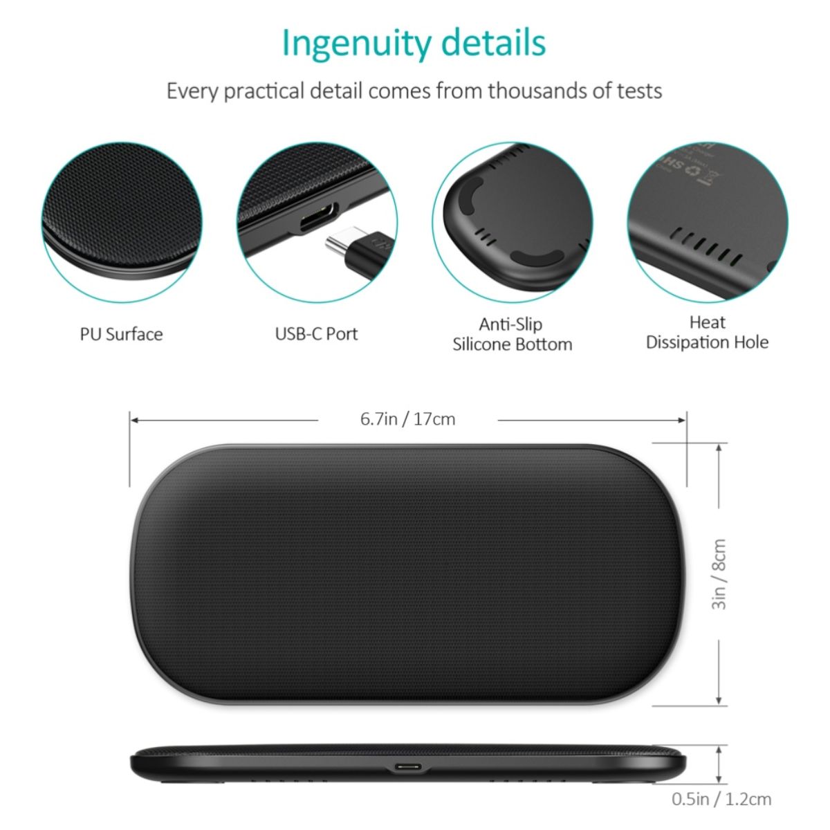 Thông số kỹ thuật: 1. Đầu vào: DC5V / 2.0A, tối đa 9V / 2.0A. 2. Công suất 1: 5W / 7.5W / 10W (điện thoại di động). Đầu ra 2: 2W (iWatch). 4. Chất