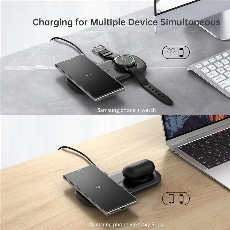 Bạn đang sở hữu nhiều sản phẩm của chuỗi Galaxy. Bạn có quá nhiều dây sạc cho từng loại sản phẩm khác nhau như dây sạc cho tai nghe, điện thoại, Galaxy Watch và bạn luôn gặp phiền phức với chỗ dây sạc rối rắm trên bàn. Đừng lo, hãy để chúng tôi giới thiệu đến bạn sản phẩm đến từ nhà CHOETECH đó là Đế sạc nhanh không dây 15W 2 in 1 hiệu CHOETECH T570-S Đây sẽ là sản phẩm hữu ích giúp bạn giải quyết được phiền não về dây, cáp sạc từ trước đến nay. Đế sạc nhanh không dây 15W 2 in 1 hiệu CHOETECH T570-S có kiểu dáng thiết kế mới lạ và nhiều chức năng khác chờ bạn khám phá.