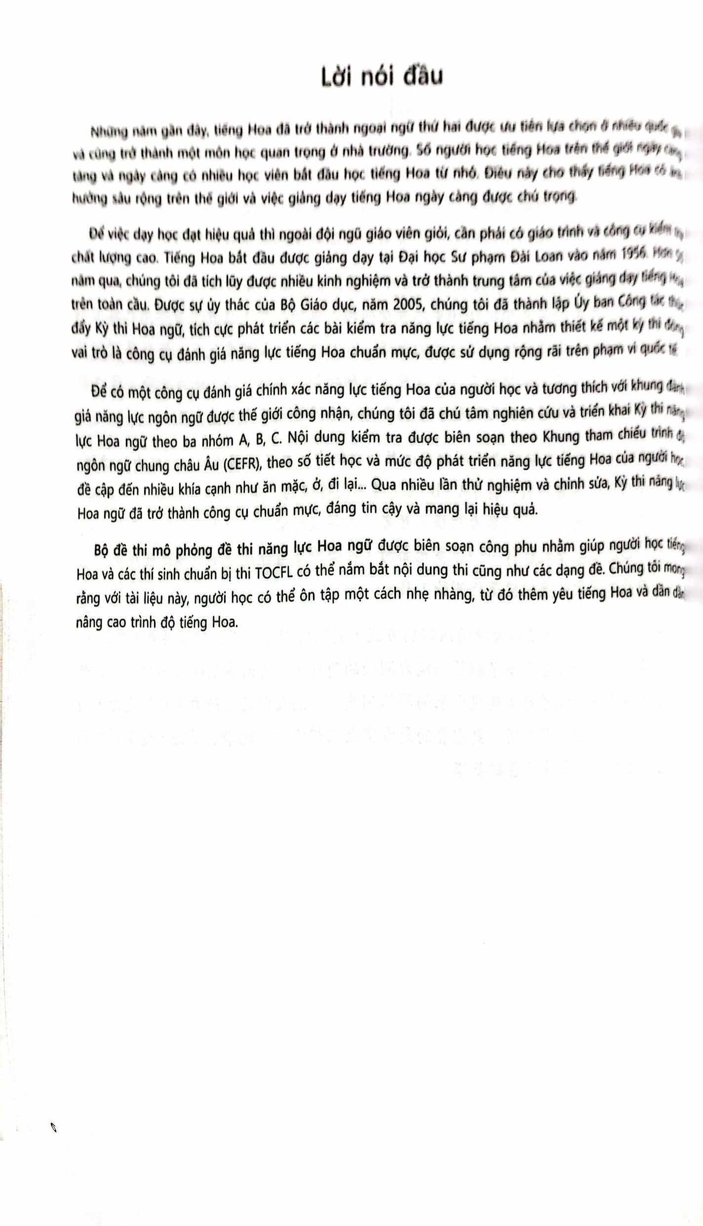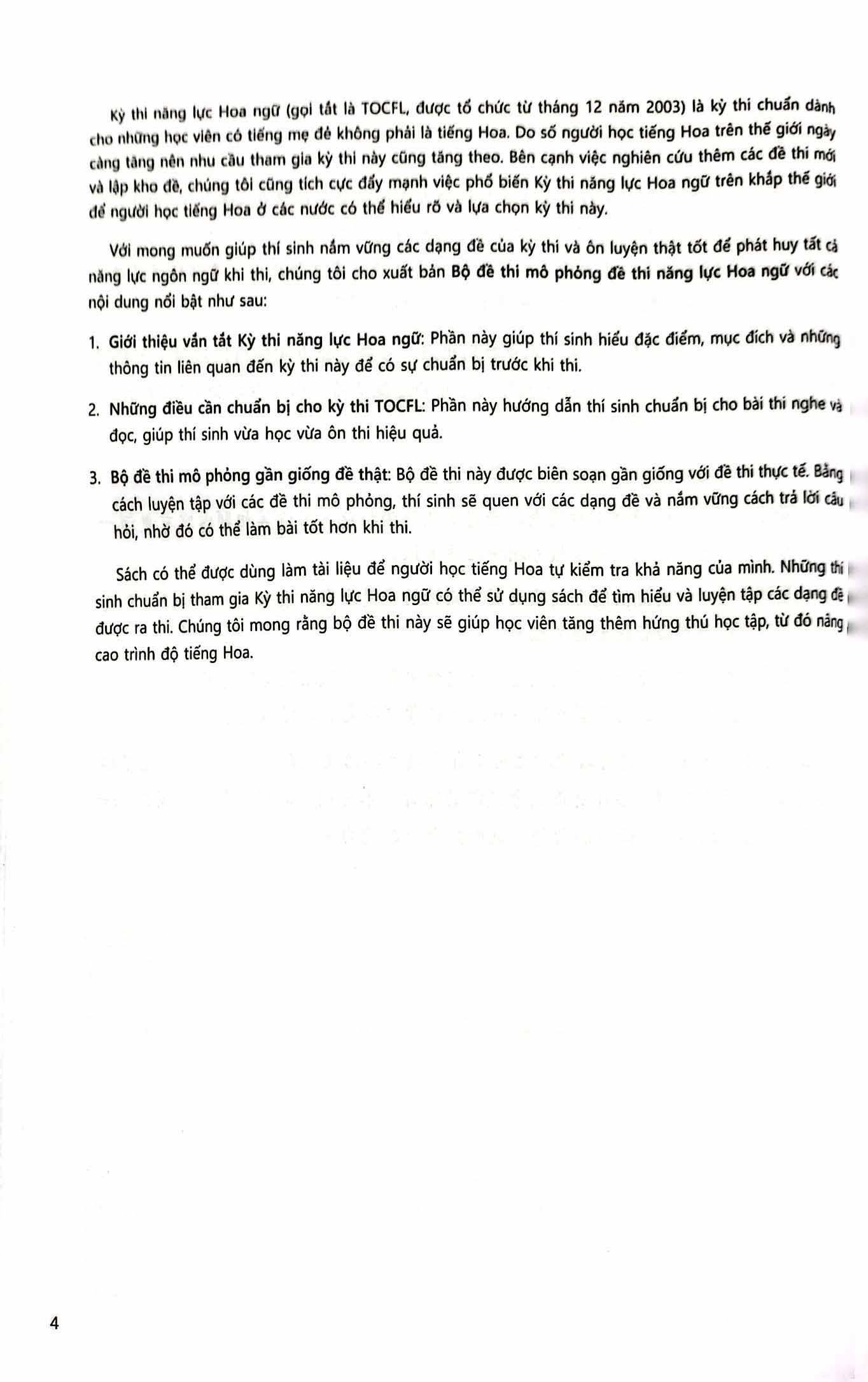 Những năm gần đây, số người mới học tiếng Hoa ngày càng tăng. Để giúp các học viên này có thể kiểm tra kết quả học tập của bản thân trong thời gian ngắn cũng như khích lệ họ tiếp tục học, chúng tôi đã chú tâm nghiên cứu và phát triển bài thi năng lực Hoa ngữ ở cấp độ chuẩn bị như xuất bản bộ đề thi mô phỏng ở cấp độ chuẩn bị. Bộ đề thi sẽ giúp các học viên mới học tiếng Hoa hiểu rõ hơn nội dung và cách thức thi đồng thời kiểm tra xem họ học có đúng phương pháp hay không.