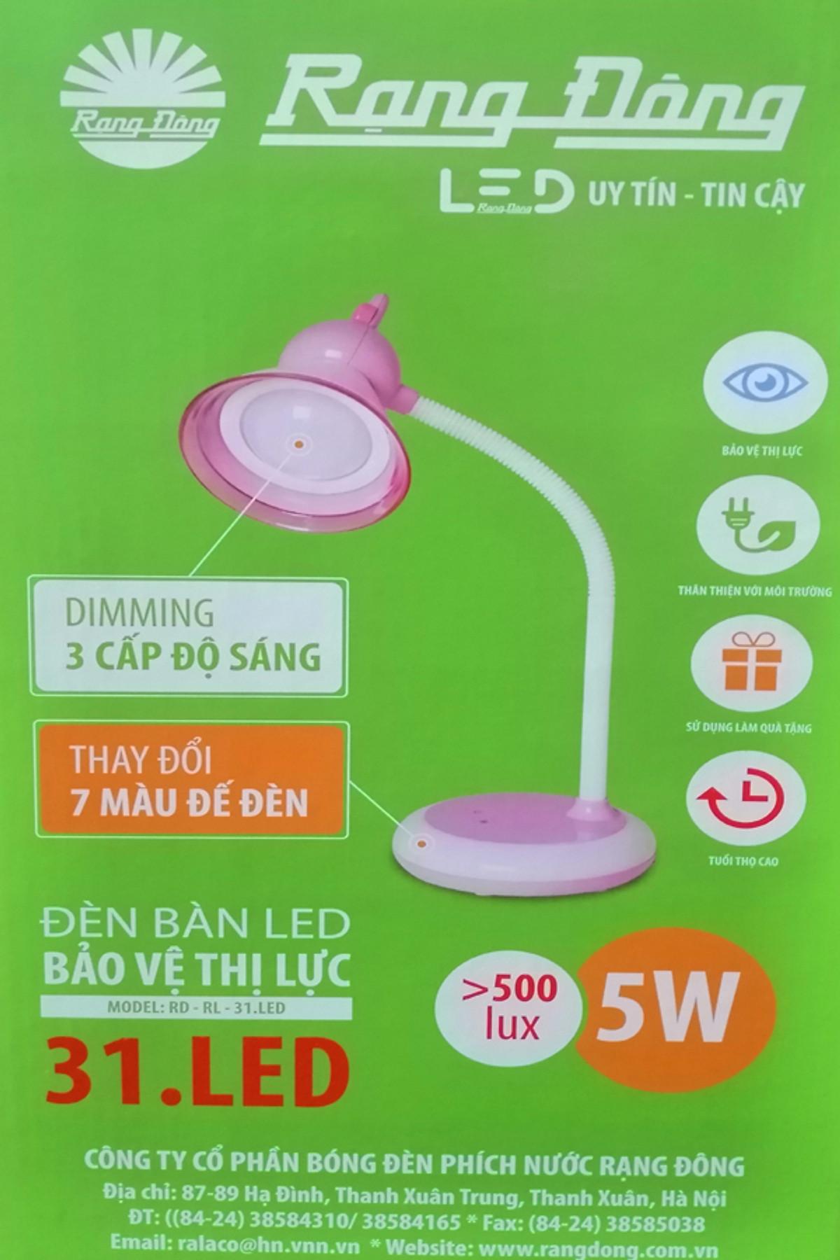 I. MÔ TẢ KỸ THUẬT: 1. Đặc tính của đèn: · Model : RD-RL-31.LED · Nguồn điện danh định: 220V/50Hz. · Công suất: 5W · Đèn bàn LED Rạng Đông bảo vệ thị lực ·