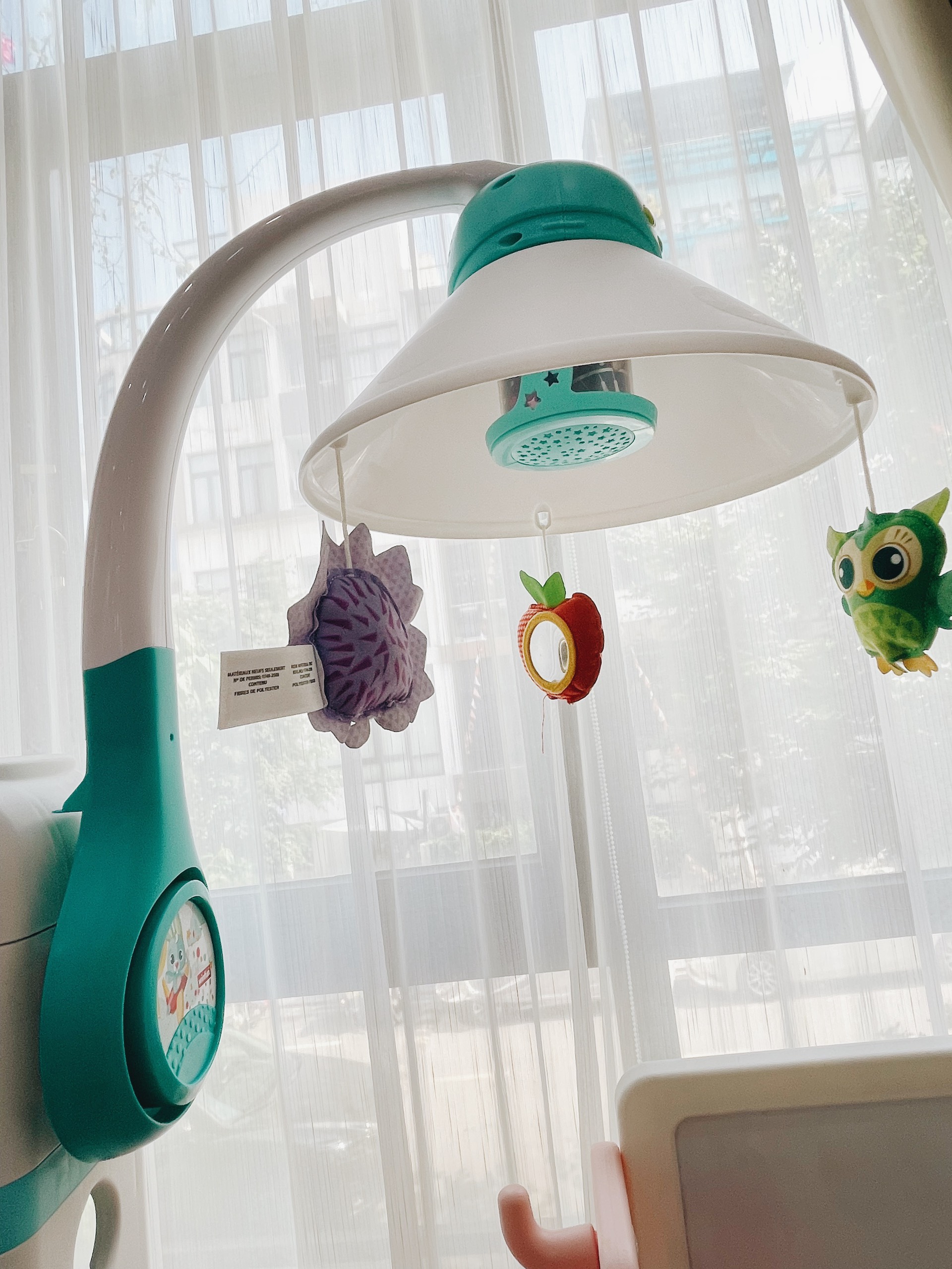 - Đồ chơi treo nôi, như 1 máy chiếu bóng di động với 3 người bạn rừng xanh dễ thương xoay xung quanh