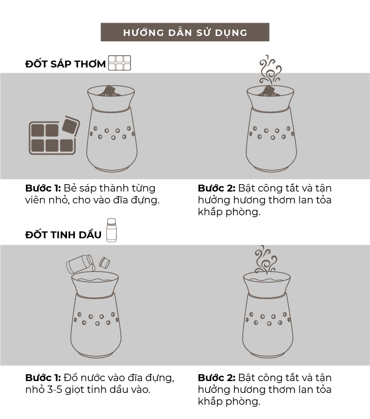 Đèn khuếch tán hương thơm sử dụng bóng đèn Edison để làm sáp ấm lên và tan chảy trong đĩa, từ đó lan tỏa hương thơm trong không khí. HƯỚNG DẪN SỬ DỤNG
