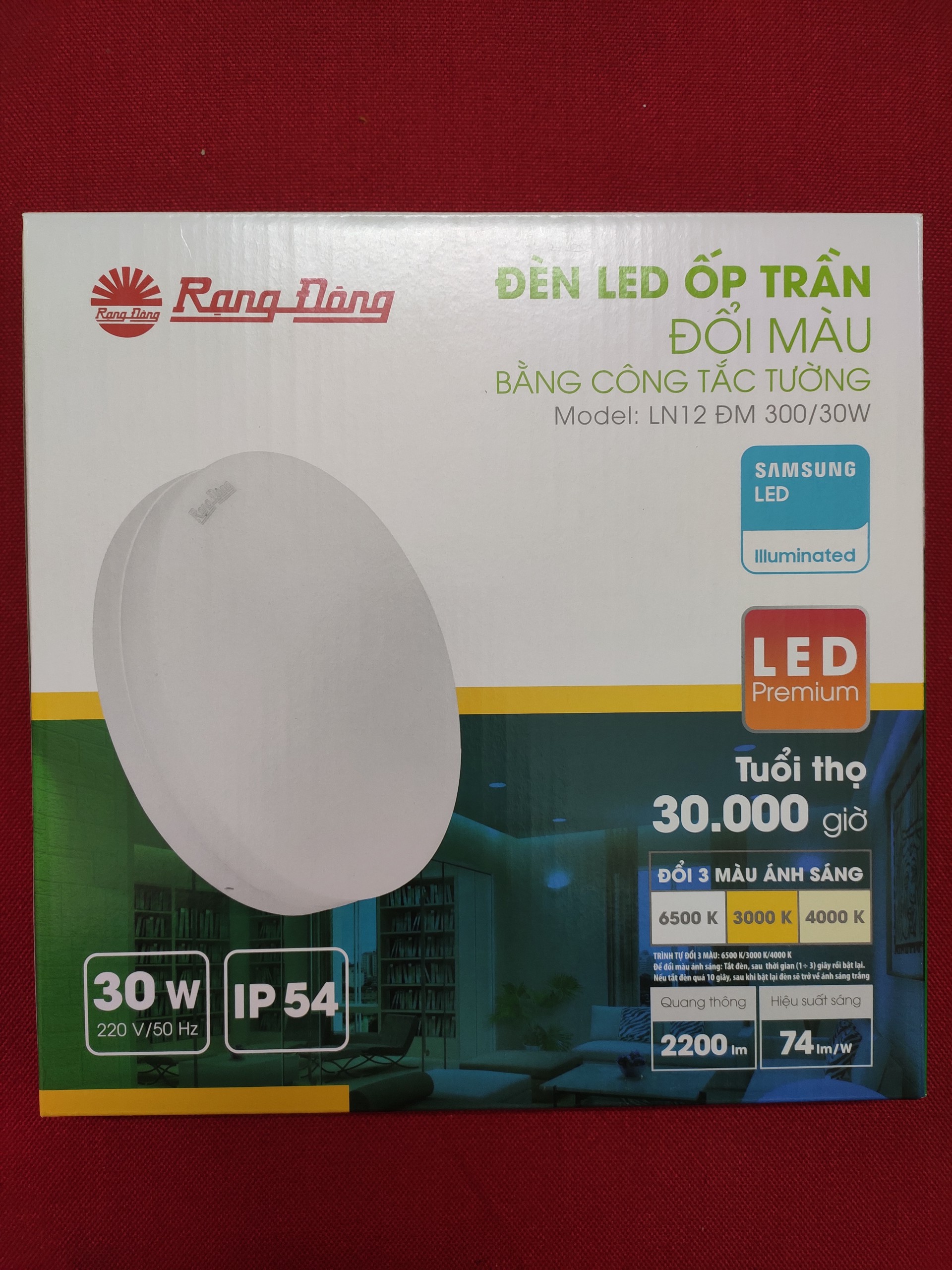 Shop thương hiệu Rạng Đông uy tín, tin cậy Model: LN12N ĐM 300/24W Điện áp: 220 V/50 Hz Nhiệt độ màu: 6500K/4000K/3000K Quang thông: 2000 lm/2000lm/1800lm Kích thước (ØxH): (300x36)mm Tuổi thọ 25000h Chỉ số