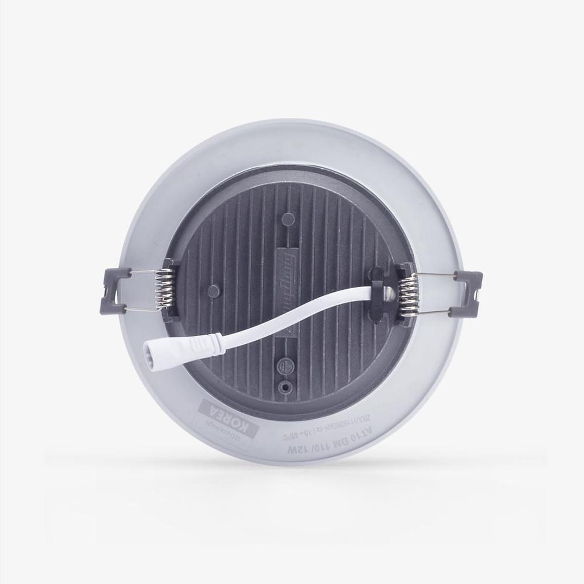 Đèn LED âm trần downlight đổi màu 12W viền bạc MODEL: AT10 ĐM 110/12W Điện áp hoạt động: 220V/50Hz Quang thông: 1200lm Đổi 3 màu: 6500K/3000K/4000K Kích thước (ØxH): (138x36)mm ĐK lỗ khoét trần: 110mm