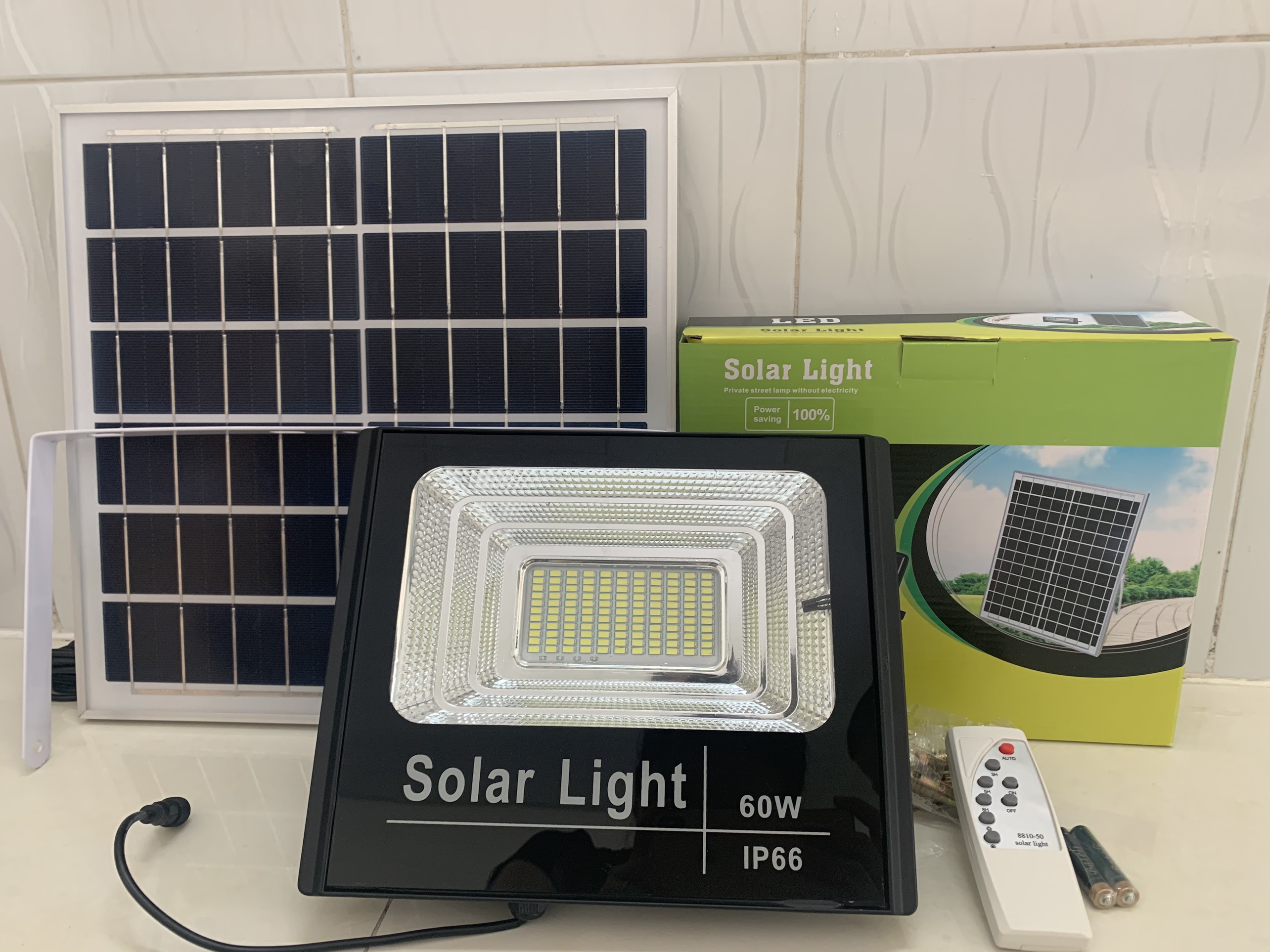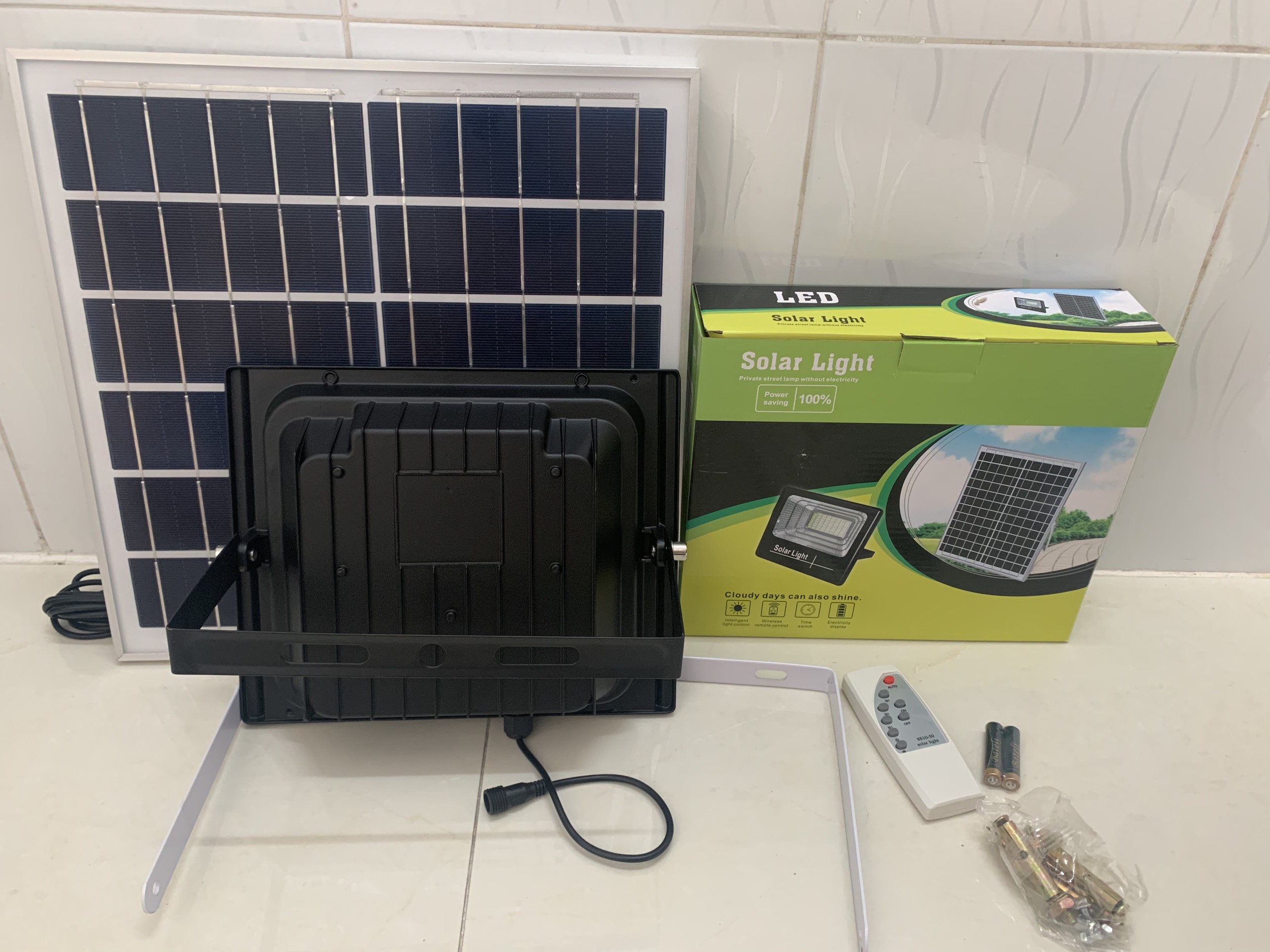 - Bộ sản phẩm gồm: đèn, tấm pin năng lượng mặt trời, giá đỡ đèn, giá đỡ tấm pin, remote, hướng dẫn sử dụng.