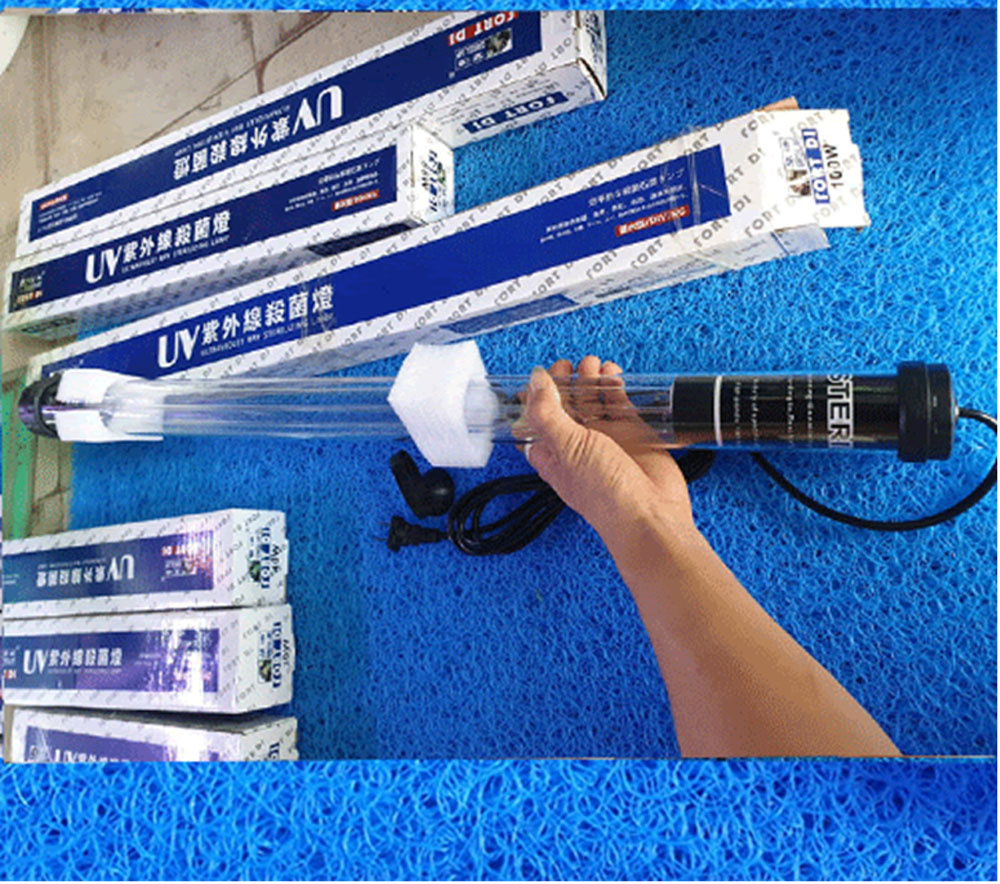 - Sử dụng tia UVC, ống thủy tinh thạch cao truyền tải tia cực tím tốt. Công dụng: Diệt rêu, nấm, diệt khuẩn hồ cá, bể cá, ngăn tảo sinh trưởng. Cách dùng: Đặt đèn ngập toàn bộ trong nước ở trong bể lọc, có thể là ngăn máy bơm, tốt nên đặt nằm ngang sao cho ánh sáng tác dụng lên nước là tối đa. Khi hồ đang bùng phát tảo, nên BẬT 24/24H cho tới khi hết sạch tảo. Khi chất lượng nước hồ ổn định, nên bật từ 2 – 4 tiếng/ngày tùy theo mức độ nắng và mái che hồ. Lưu ý: CHE CHẮN SÁNG SÁNG TỪ ĐÈN, KO ĐỂ ĐÈN TIẾP XÚC MẮT TRỰC TIẾP