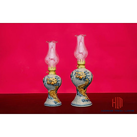 Đèn dầu Bát Tràng - Sản phẩm bao gồm: đèn + bóng đèn - Kích thước: cao 30cm tính cả bóng đèn - Đèn dầu Bát Tràng men lam bọc đồng được nung ở nhiệt