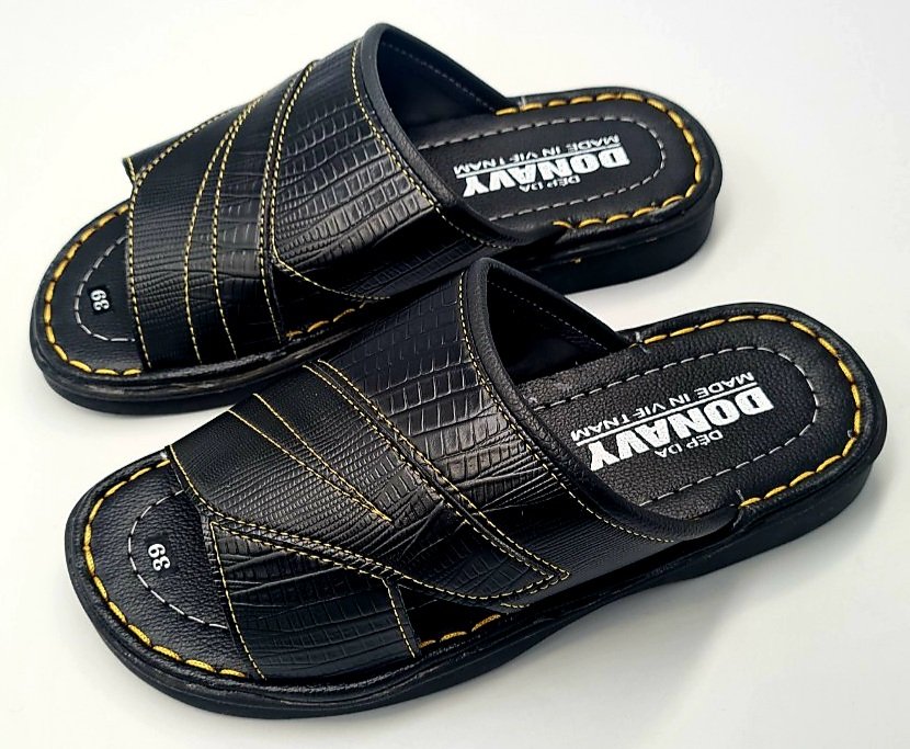 Dép Da Nam - Lịch Lãm & Thoải Mái Mỗi Ngày - Chất liệu cao cấp: Sử dụng da tổng hợp chất lượng, mềm mại, bền bỉ theo thời gian, mang lại cảm giác êm ái và thoáng khí cho bàn chân. - Thiết kế sang trọng: Tông màu đen lịch lãm, kết hợp với đường chỉ may tinh tế và logo kim loại nổi bật – tôn lên vẻ nam tính, trưởng thành. - Đế chống trượt: Đế EVA siêu nhẹ, độ đàn hồi tốt, kết hợp vân đế tăng độ ma sát – an toàn khi di chuyển trên nhiều bề mặt. - Form ôm chân: Thiết kế bản quai ngang rộng, ôm gọn bàn chân nhưng không gây bí bách, dễ xỏ vào – thích hợp cho người trung niên và người lớn tuổi. - Ứng dụng đa năng: Phù hợp sử dụng trong nhà, đi dạo phố, đến văn phòng hoặc các dịp gặp gỡ thân mật. Lựa chọn tuyệt vời cho quý ông yêu thích sự thoải mái, đơn giản nhưng vẫn giữ được nét tinh tế trong từng bước chân.