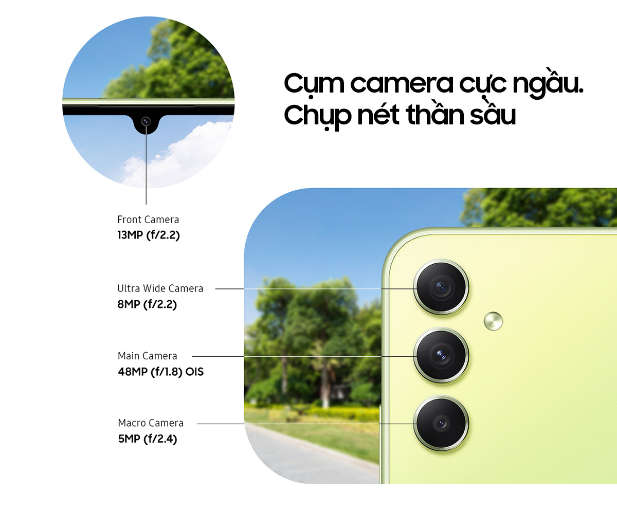 - Màn hình: 6.7 inch Super AMOLED, Full HD+, tần số quét 90Hz - Chipset: Exynos 1330, CPU 8 nhân - RAM: 8GB - Bộ nhớ trong: 128GB - Camera sau: 50MP (chính, OIS) +