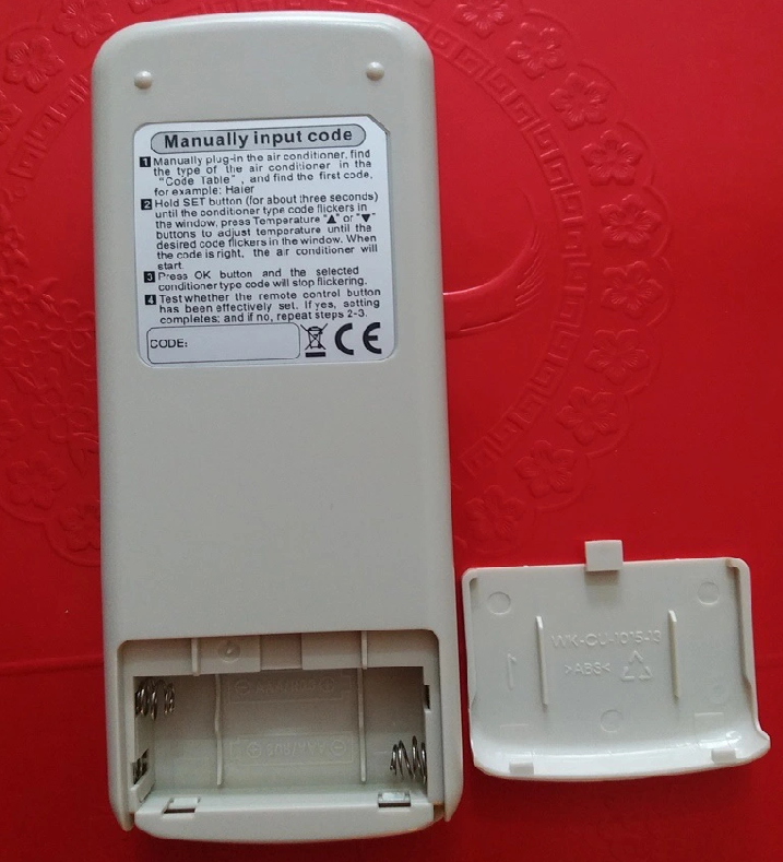 - Khối lượng 90 gram Hướng dẫn cài đặt tần số điều khiển đa năng điều hòa. Cách cài đặt remote đa năng bằng tay: Bước 1: Bật điện vào điều hòa. Hướng điều khiển về mắt nhận tín hiệu trên điều hòa. Bước 2: Bấm và giữ nút “SET” (khoảng 3 đến 5 giây) cho đến khi mã tần số trên màn hình nhấp nháy,Ấn nút tăng/giảm Nhiệt Độ▲ ▼ cho đến khi chọn được tần số thích hợp (VD: Tần số điều hòa Fujitsu là từ 700 đến 719). Khi chọn đúng mã, điều hòa sẽ bận lên hoặc có tiếng kêu tít tít. Bước 3: Bấm nút “OK” để xác nhận, khi đó tần số được xác lập và mã tần số sẽ hết nhập nháy. Bước 4: Kiểm tra xem các nút trên điều khiển đã hoạt động đúng hay không. Nếu hoạt động đúng có nghĩa quá trình cài đặt đã hoàn tất. Cách cài đặt remote đa năng tự động. Nếu điều hòa không có mã Code thì phải dò tự động theo cách sau: Hướng điều khiển về phía điều hòa.Bấm và giữ nút "Set"(Khoảng 6 giây) điều khiển sẽ tự động chạy dò mã bắt đầu từ 000 đến 999. Khi nào thấy điều hòa có tiếng kêu tít tít là đã dò đúng mã. (Chú ý:Khi điều khiển dò đúng mã của điều hòa nhưng vì dò tự động nên mã vẫn nhảy liên tục đi lên ví dụ mã là 291 nhưng lại vẫn dò lên cao hơn là 300.Ấn phím điều chỉnh nhiệt độ xuống khi nào thấy kêu tít tít là đúng mã). Ấn nút Ok>Quá trình cài đặt đã hoàn tất.