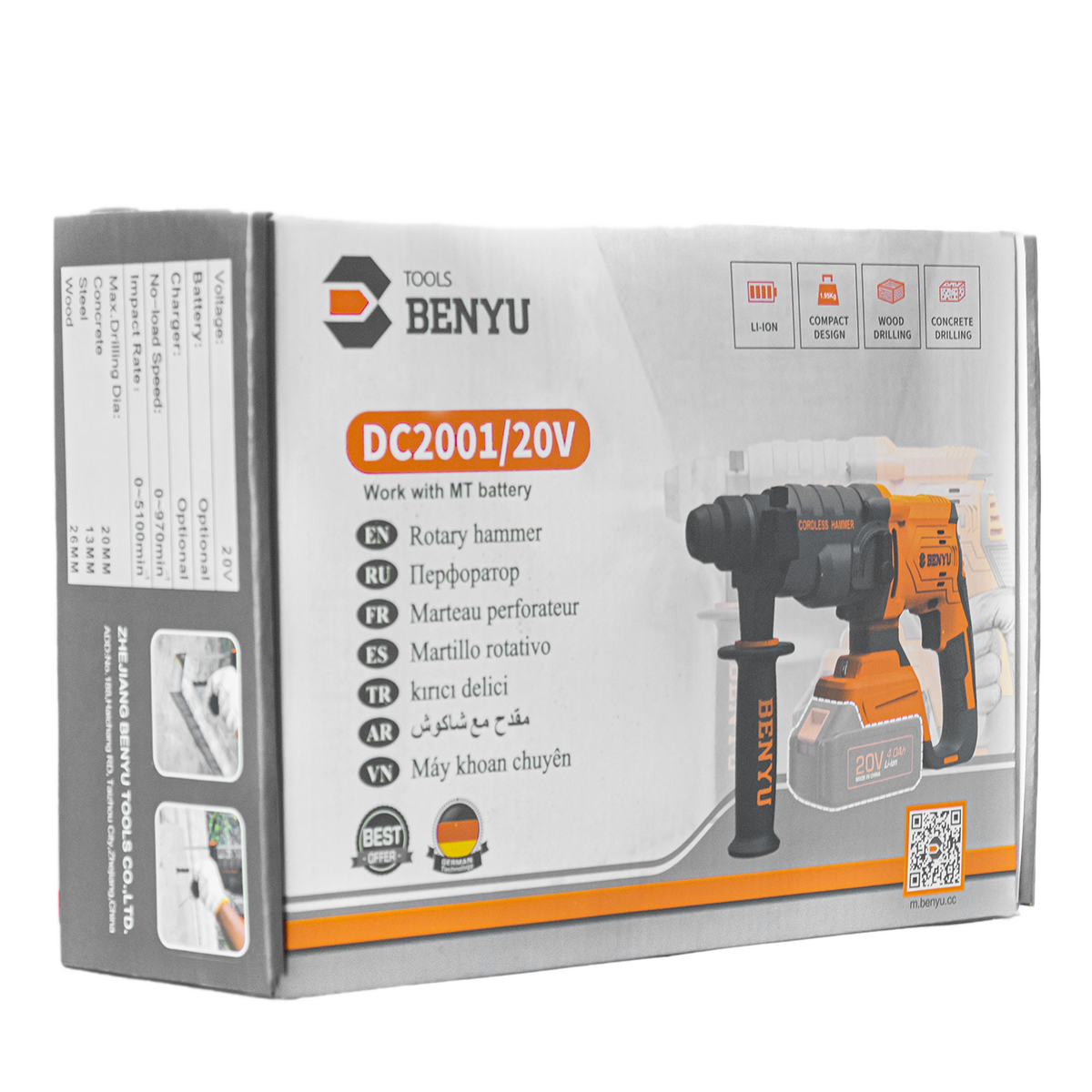Máy khoan bê tông dùng pin Benyu DC2001/20V dễ dàng chuyển đổi chế độ khoan, khoan búa và búa Máy khoan búa dùng pin thiết kế nhỏ gọn phù hợp cho nhu cầu sử dụng gia đình. Máy khoan búa dùng pin Benyu DC2001/20V sử dụng pin Lithium ion dung lượng 4.0Ah có khả năng sử dụng trong thời gian dài.