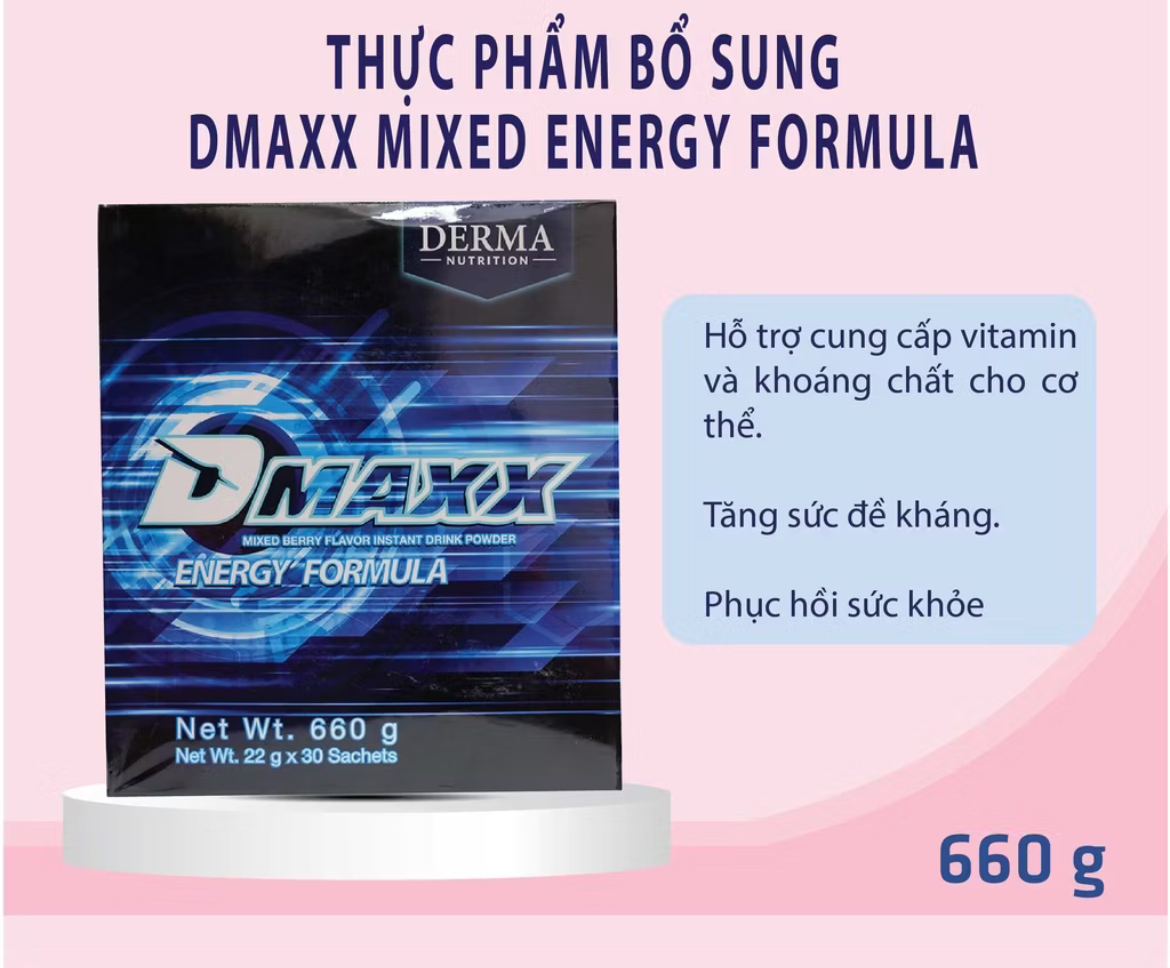 Dmaxx energy formula là sản phẩm thức uống năng lượng có chức năng bổ sung năng lượng cho người uống mỗi ngày dưới dạng thức uống hòa tan.