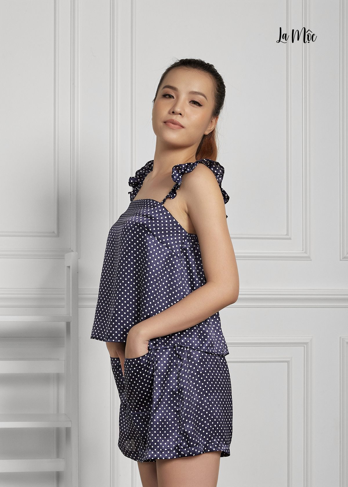 Đồ bộ mặc nhà áo hai dây buộc nơ màu xanh họa tiết chấm bi nhí - LA MỘC chất liệu vải SATIN LỤA. Thiết kế chú trọng từng đường may. Mang lại cảm giác