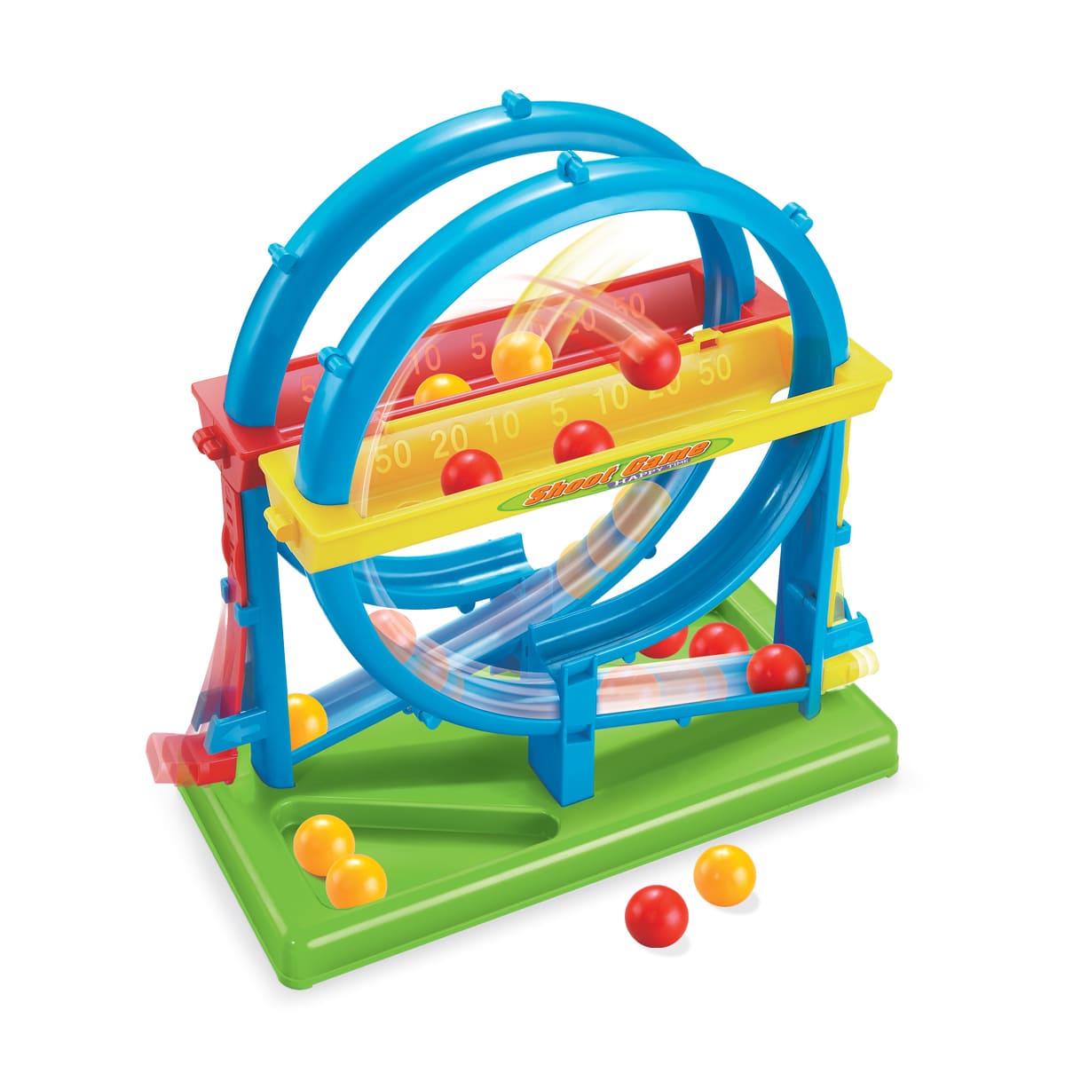 - Sản phẩm bao gồm: vòng đua bóng với 2 đường đua song song dành cho 2 đội chơi, số lượng bóng 2 màu vàng + đỏ.