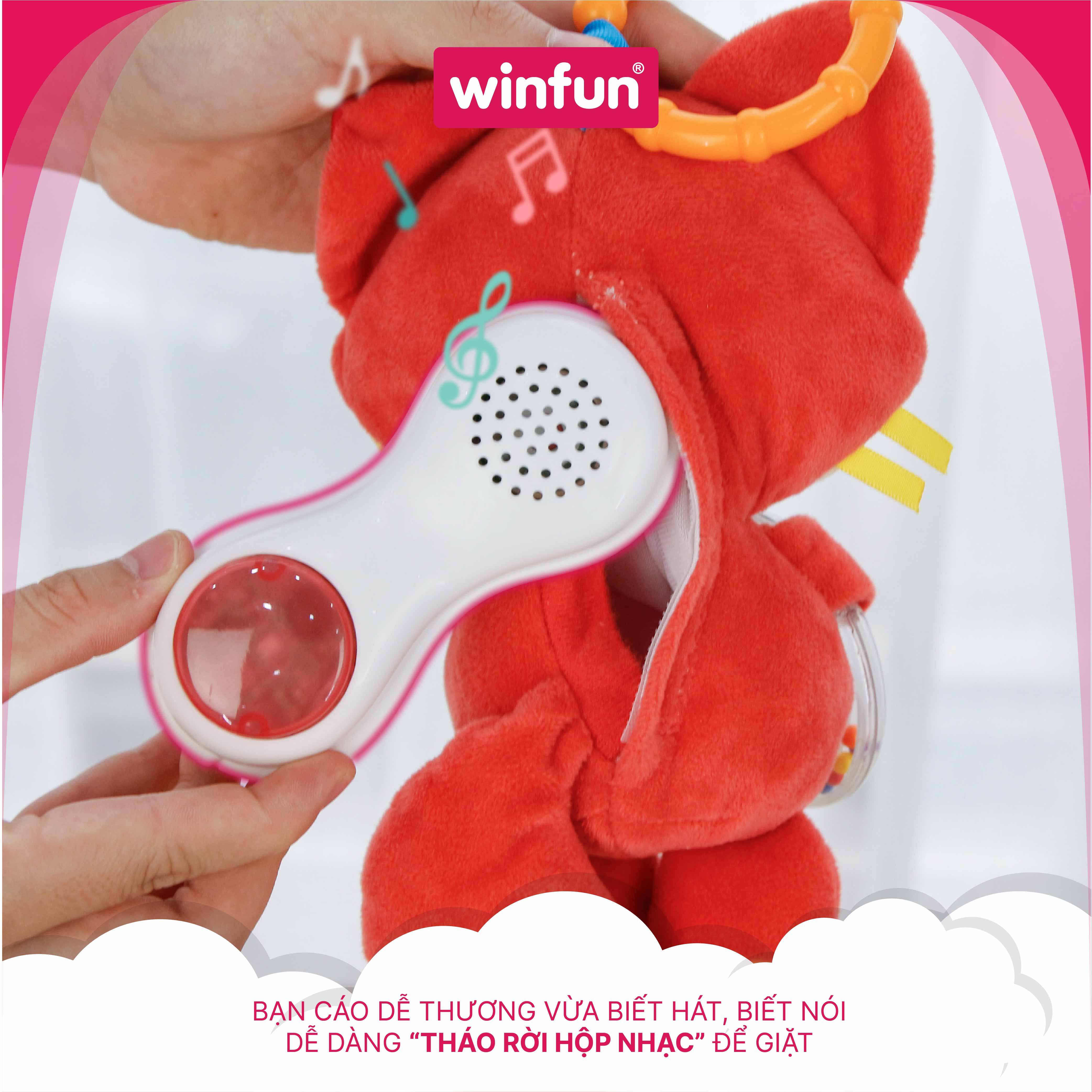 Đồ chơi winfun là người bạn tuổi thơ của con trẻ và là người bạn đồng hành cùng quá trình lớn lên của con. Vì ý nghĩa lớn lao đấy, WINFUN đưa ra chính sách HỖ TRỢ SỬA CHỮA TRỌN ĐỜI cho sản phẩm chính hãng. WINFUN - Đồng hành cùng bé yêu khôn lớn. ️ ĐẶC ĐIỂM NỔI BẬT •Đồ chơi sơ sinh – đồ chơi tiền giáo dục -Với thiết kế hình bạn cáo dễ thương, làm từ chất liệu bông mềm mại, bé yêu sẽ có cảm giác giống như đang chơi với thú cưng của mình. -Bé còn có thể sử dụng bạn cáo như một chú gấu bông để ôm hay là người bạn đồng hành với bé mỗi khi đi ngủ, mang lại giấc ngủ ngon lành cho bé -Giúp bé phát triển thị giác, thính giác, xúc giác, khả năng phản ứng với các tín hiệu -Thiết kế vòng treo nôi, bé có thể mang đi mọi nơi, có thể kẹp vào mọi vị trí, là người bạn đồng hành thời thơ ấu của bé -Bạn cáo dễ thương vừa biết hát, biết nói khi bé nhấn nút ở thân bạn cáo hoặc bé lắc bạn cáo sẽ cảm ứng và phát âm thanh. Bạn cáo sẽ hát và nói các câu chào đơn giản, bé có thể nghe và hiểu một cách dễ dàng thông qua giọng nói của nó -Đồng thời bé còn có thể được tiếp xúc với tiếng anh từ sớm, khả năng nghe và phát âm của bé sẽ trở nên chuẩn và chính xác hơn. -Bé còn được làm quen với các con chữ cơ bản như A,B,C thông qua các bản nhạc vui nhộn, phát triển thính giác cho trẻ. -Dễ dàng tháo rời hộp nhạc để giặt •Chất liệu an toàn, cao cấp -Chất liệu bông mềm mại, không làm làn da non nớt của bé bị dị ứng, mẩn đỏ,chống bay rụng long, an toàn cho sức khỏe của bé. -Cường độ âm thanh đạt tiêu chuẩn y khoa về âm thanh trong phòng, đảm bảo thính lực của bé -Sản phẩm đạt nhiều chứng nhận tiêu chuẩn quốc tế khắt khe như Tiêu chuẩn EN71 (Châu Âu), ASTM (Mỹ) •Bảo hành chính hãng -Bảo hành chính hãng 3 tháng -Xuất phát từ nỗi niềm của phụ huynh, chúng tôi đã đưa ra chính sách HỖ TRỢ SỬA CHỮA TRỌN ĐỜI cho đồ chơi chính hãng WINFUN - một người bạn gắn liền tuổi thơ của bé THÔNG TIN SẢN PHẨM - Tên sản phẩm: Đồ chơi treo nôi cảm ứng phát nhạc - bạn cáo dễ thương Winfun - Mã sản phẩm: WF720021-01 - Thương hiệu: WINFUN - Xuất xứ: HongKong - Chất liệu: Vải, bông, BPA Free (không chất độc hại) - Kích thước sử dụng: 19x12x9cm - Kích thước đóng hộp: 23x21x9cm - Cân nặng thực tế: 150g - Sử dụng pin AAA - Chứng nhận an toàn chất lượng: ASTM (Mỹ), EN71 (Châu Âu) - Bảo hành chính hãng: 3 tháng - HỖ TRỢ SỬA CHỮA TRỌN ĐỜI