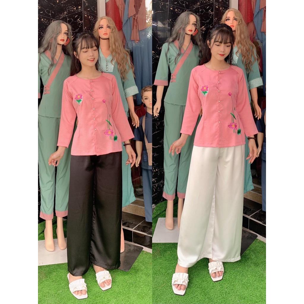Đồ lam đi chùa - áo xống đi chùa - Đồ lam phật tử - Bộ đồ đi lễ chùa thêu sen cổ tàu (Ảnh + Video cửa hàng tự quay)