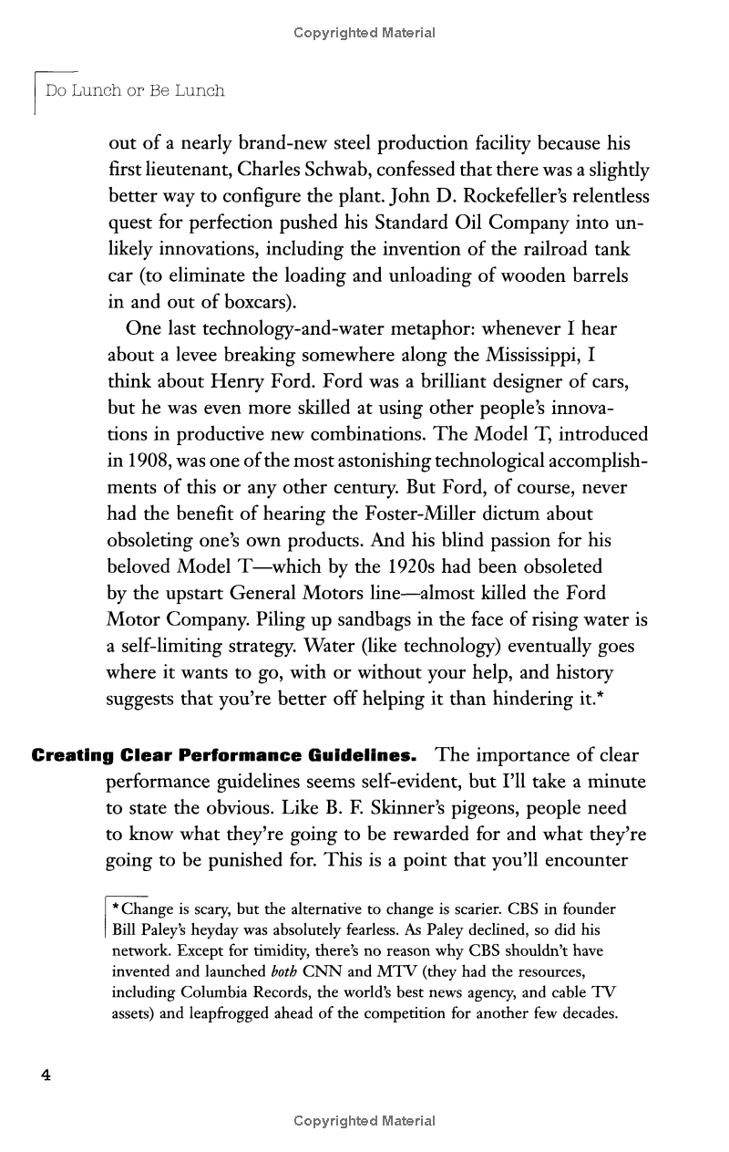 Here is a refreshing antidote to the change manifestos and reinvention tracts that currently crowd the business bookshelves. Do Lunch or Be Lunch is a provocative argument for predictability as the most powerful of management tools.