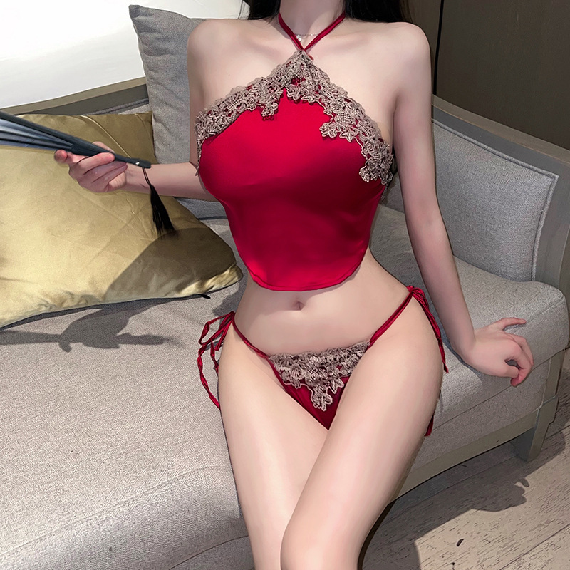 ✨Đồ Ngủ Cổ Yếm Kiểu Trung Hoa Lụa Satin Đỏ,Set Nội Y Quần Cột Dây + Áo Lụa Cổ Tàu Gợi Cảm,Yếm Lụa Sexy Phối Ren Hoa Vintage, Set Yếm Ren Lụa Đỏ Đô Gợi Cảm ,Bộ Nội Y Sexy Gợi Cảm Viền Ren Hoa C018