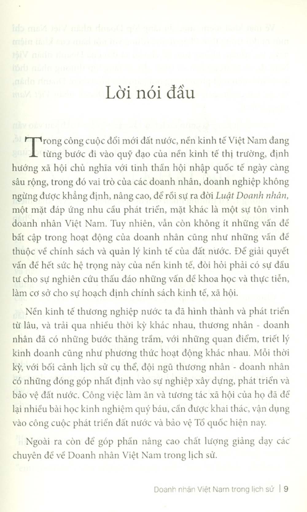 Điều đáng lưu ý là cuốn sách này không tiếp cận và đi sâu vào vấn đề giai cấp xã hội mà chủ yếu xem xét ở góc độ cấu trúc nền kinh tế, thành phần kinh tế, sự chuyển biến của nền kinh tế đất nước cùng với sự hình thành và phát triển của doanh nhân Việt Nam. Cuốn sách được kết cấu thành 7 chương trải dài thành câu chuyện kể liền mạch: Từ thương nhân đến doanh nhân - Một vài khái niệm, Thương nhân Việt Nam trước khi thực dân Pháp xâm lược, Doanh nhân Việt Nam từ giữa thế kỷ XIX đến năm 1945, Doanh nhân Việt Nam giai đoạn 1945 – 1954, Doanh nhân Việt Nam giai đoạn 1954 – 1975, Doanh nhân Việt Nam giai đoạn từ năm 1975 đến đầu thế kỷ XXI, Doanh nhân Việt Nam - Hành trang tiếp bước.
