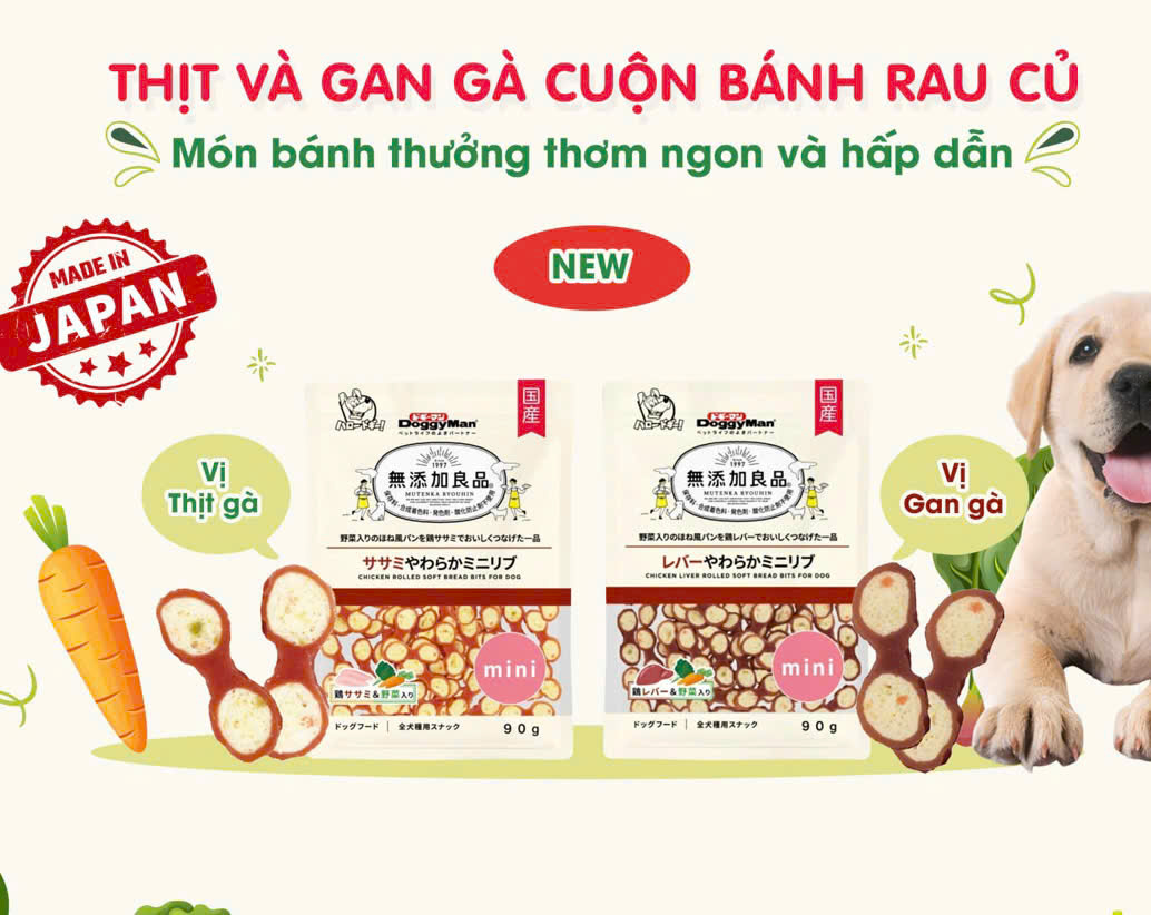 Dòng snack bán chạy hàng đầu, sản xuất tại nhà máy DoggyMan Japan ở Fukuoka. Miếng bánh mềm xốp vừa phải dậy mùi thơm thịt gà nướng. Vị ngon ngập tràn trong từng miếng bánh.