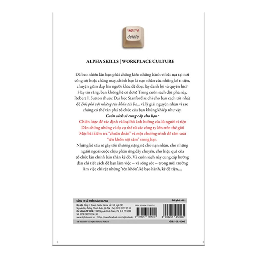 Sách - Đối phó với những tên khốn tài ba Mã hàng: 8935251412260 Tên Nhà Cung Cấp: Alpha Books Tác giả: Robert I Sutton Người Dịch: Phong Vân NXB: NXB Thế Giới Trọng lượng (gr): 300 Kích Thước Bao Bì: 13 x 20.5 cm Số trang: 256 Hình thức: Bìa Mềm Đã bao nhiêu lần bạn phải chứng kiến những hành vi bắt nạt tại nơi công sở; hoặc chẳng may, chính bạn là nạn nhân của những kẻ ti tiện, chuyện giẫm đạp lên người khác để đoạt lấy danh lợi và quyền lực? Hãy tin rằng, bạn không hề cô đơn! Trong cuốn sách đột phá này, Robert I. Sutton thuộc Đại học Stanford sẽ chỉ cho bạn cách tốt nhất để Đối phó với những tên khốn tài và lý giải nguyên nhân vì sao chúng có thể tàn phá tổ chức của bạn khủng khiếp như vậy. Cuốn sách sẽ cung cấp cho bạn: Chiến lược để xác định và loại bỏ ảnh hưởng của lũ người ti tiện Dẫn chứng những ví dụ cụ thể từ các công ty lớn trên thế giới Một bài kiểm tra “chuẩn đoán” và một chương trình để tầm soát “tên khốn nội tâm” trong bạn. Những kẻ xấu sẽ gây tổn thương nặng nề cho nạn nhân, cho những người ngoài cuộc chịu phản ứng dây chuyền, cho hiệu quả của tổ chức lẫn chính bản thân kẻ đó. Và cuốn sách này cung cấp hướng dẫn chi tiết cách để bạn làm việc và sống sót trong môi trường làm việc chỉ rặt những "tên khốn”, kẻ bạo hành, kẻ đê tiện,