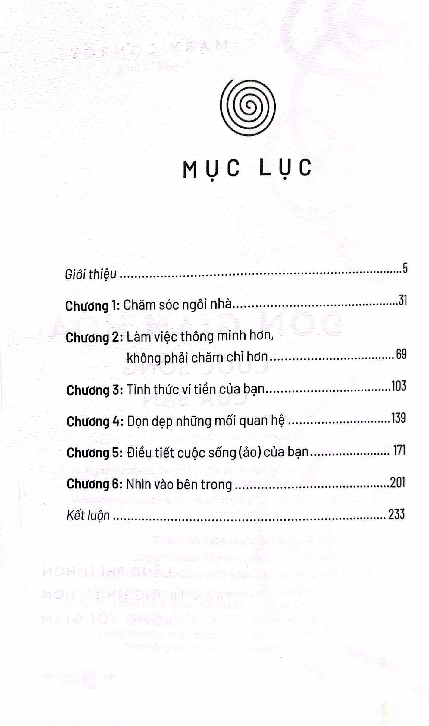 Cuốn sách được chia làm sáu phần đơn giản, rõ ràng (và ngắn gọn, trực diện) để giúp bạn bắt tay vào dọn dẹp từng khía cạnh của đời sống: căn nhà, không gian sống; công việc, chốn công sở; ví tiền, tài chính; những mối quan hệ gia đình, xã hội; đời sống trên mạng, thực tế ảo; cuối cùng là “con người bên trong bạn”. Cũng như nhiều người khác, chính bản thân tác giả Mary cũng đã sống nhiều năm với những thói quen bừa bộn trong đời sống đến khi cô nhận ra mình phải thay đổi. Sau khi áp dụng những công cụ để tối giản mọi thứ, cô nhận thấy mình đã gỡ bỏ được gánh nặng về tài chính, áp lực phải mua và kiếm tiền. Từ đó cô có được nhiều thời gian và năng lượng để tập trung được nhiều hơn vào cuộc sống, công việc, sức khỏe thể chất và tâm hồn, xây dựng những mối quan hệ có ý nghĩa cả trên mạng và ngoài đời thực.