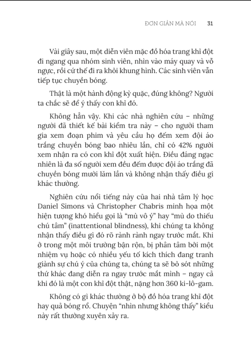 Trong một thế giới không ngừng “dội bom” chúng ta với hàng triệu thông tin mỗi ngày, sự đơn giản chính là chìa khóa để thông điệp của bạn không bị hòa lẫn trong ma trận đó. Mở đầu cuốn sách, Guttmann chia sẻ một số kiến thức cơ bản để giúp chúng ta hiểu rằng bộ não con người rất dễ bị quá tải khi đón nhận nhiều thông tin và yếu tố kích thích. Những thông điệp phức tạp không chỉ khó kết nối với não bộ mà còn thường khiến bộ não bối rối, áp lực và kém tập trung. Ngược lại, thông điệp đơn giản sẽ nổi bật vì chúng dễ hiểu, dễ nhớ và dễ phản ứng.
