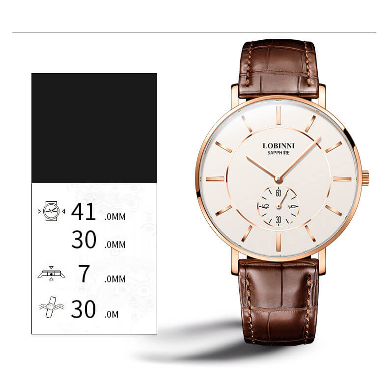 Nhãn hiệu LOBINNI Mã sản phẩm No.16056-2 Giới tính Nam Kiểu máy Automatic (Máy Cơ) Đường kính mặt 41 mm Độ dày 11 mm Chất liệu vỏ Thép không gỉ 316L Chất liệu dây Dây da cao cấp Chất liệu mặt kính Sapphire Crystal