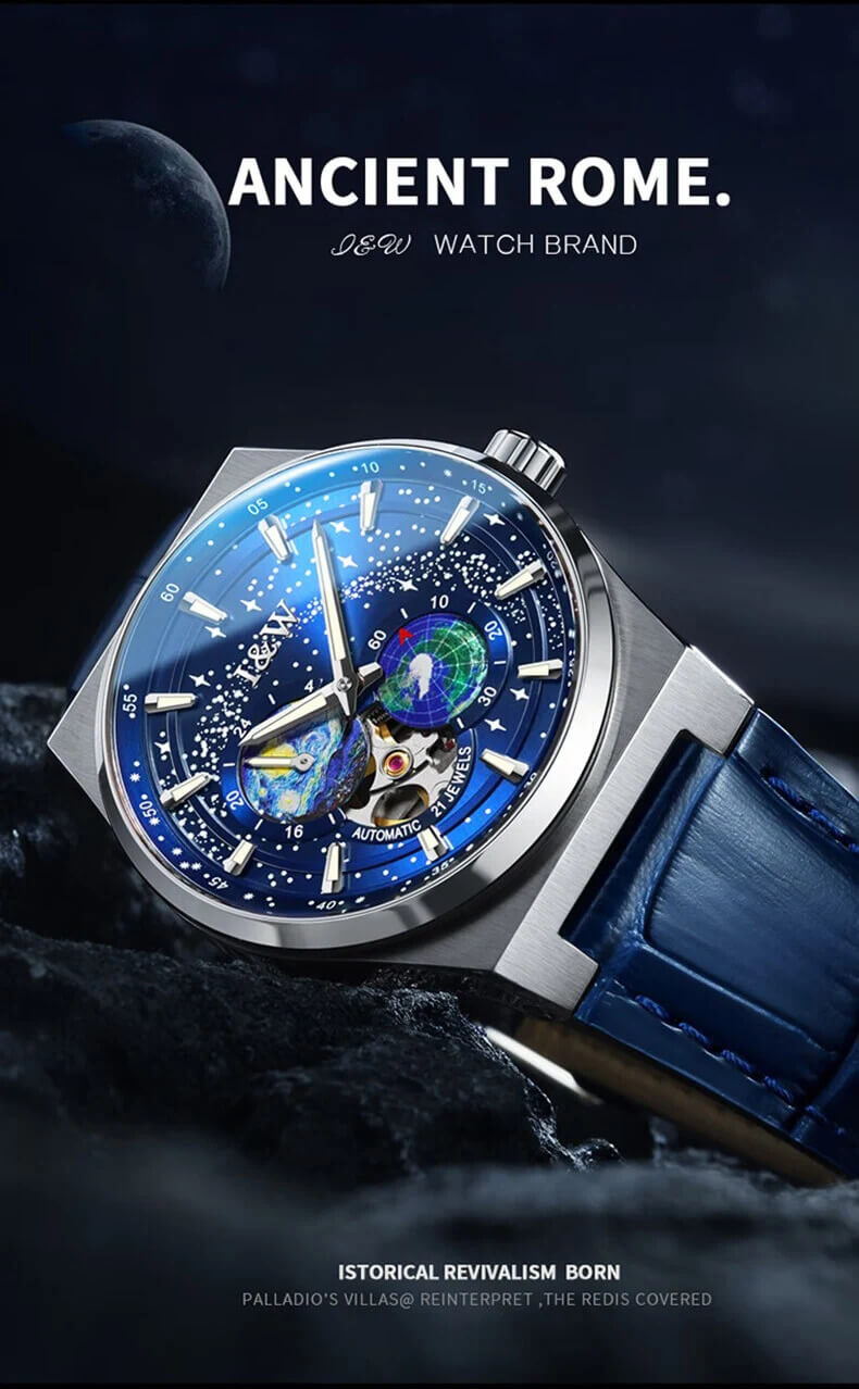 Sự kết hợp hoàn hảo đến khó tin của mặt dial vạn vì sao lấp lánh như bầu trời trong đêm cùng với sự sáng tạo kim giây mô phỏng vòng quay của Trái Đất không ngừng nghỉ (đặc sắc hơn với dạ quang siêu sáng ban đêm)