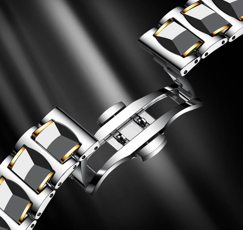 Đặc điểm kỹ thuật - - Vật liệu vỏ / gờ: Mạ ion - Chốt gập 3 chỉ với một lần bấm - Dây đeo bằng thép không gỉ - Mặt kính khoáng - Khả