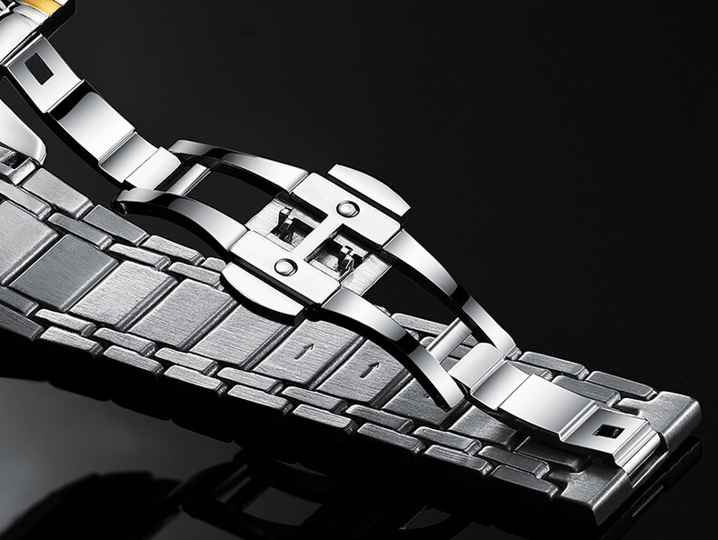 Đặc điểm kỹ thuật - - Vật liệu vỏ / gờ: Mạ ion - Chốt gập 3 chỉ với một lần bấm - Dây đeo bằng thép không gỉ - Mặt kính khoáng - Khả