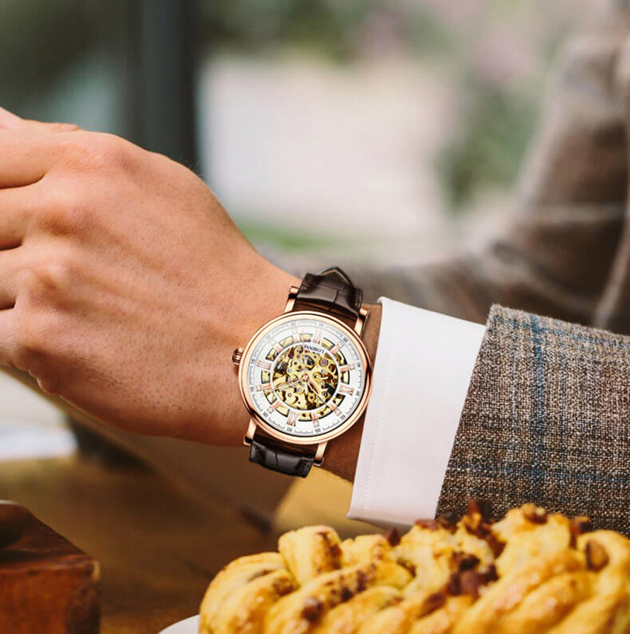 ❏ Vàng hồng 18K: Là vàng nguyên khối, phủ trọn gần như là toàn bộ mặt số đồng hồ LOBINNI L9010-2. Trong khi đó, sự sang trọng lại được kết hợp với nền tảng Skeleton độc đáo, giúp các quý ông chìm đắm ở cả mặt trước lẫn mặt sau thiết kế.