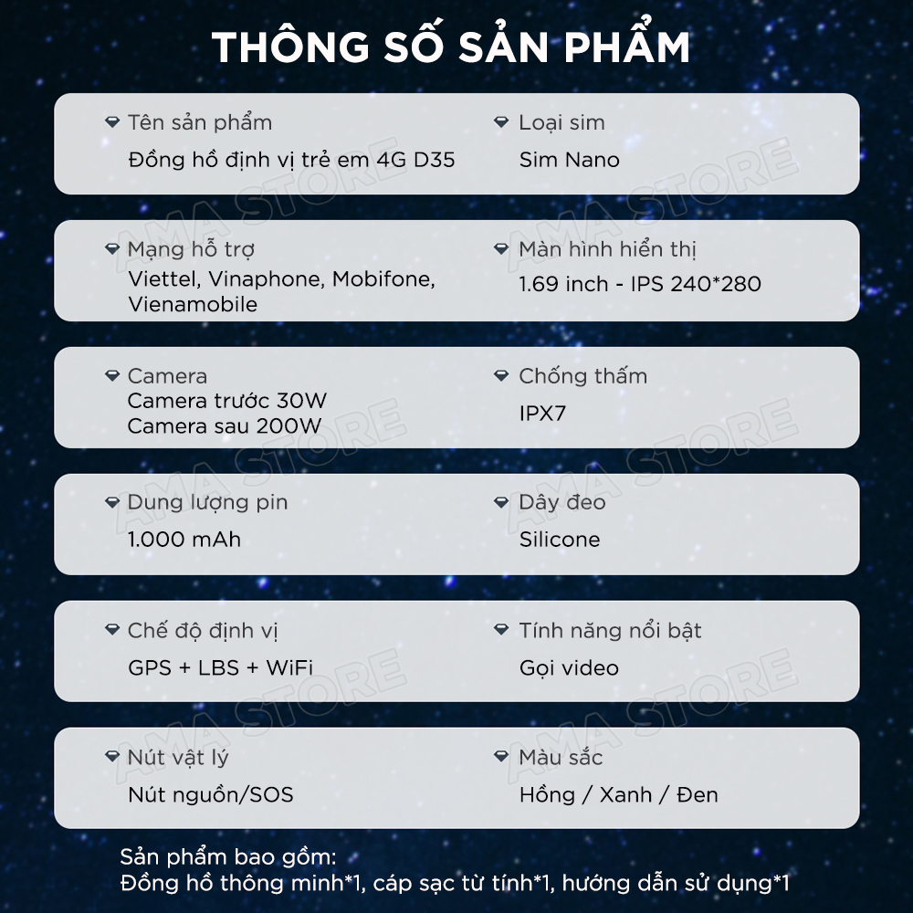 - Đồng hồ AMA Watch D35 có mặt tại Việt Nam cuối năm 2022 với rất nhiều chức năng tiện tích thiết yếu cho Lứa tuổi học sinh. Ngoài các tính năng chính như khả năng chống nước, thực hiện cuộc gọi Video HD, Định vị chính xác và Ổn định với sai số định vị chỉ 5 - 10m. D35 còn được trang bị 2 Camera chất lượng cao (Camera trước 30W, Camera sau 200W) giúp trẻ thoải mái thực hiện đam mê nhiếp ảnh.